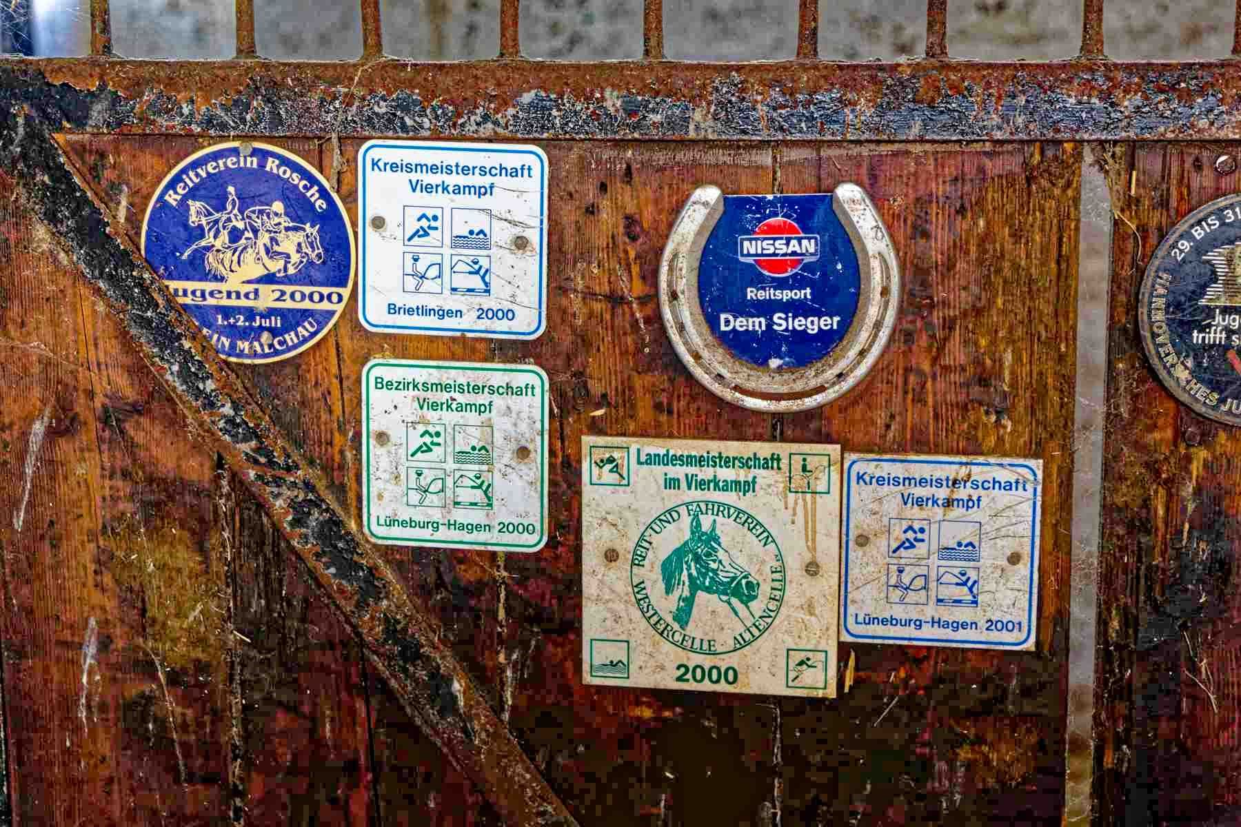 Nahe einem Kleinstadtbahnhof bin ich auf diesen verlassene Reitanlage aufmerksam geworden. Sehr schön waren die Pferdeboxen anzusehen, teils mit Namensschildern und Auszeichnungen - und vor allem haben die Graffiti-Aktivisten hier noch nicht ihr Unwesen getrieben.