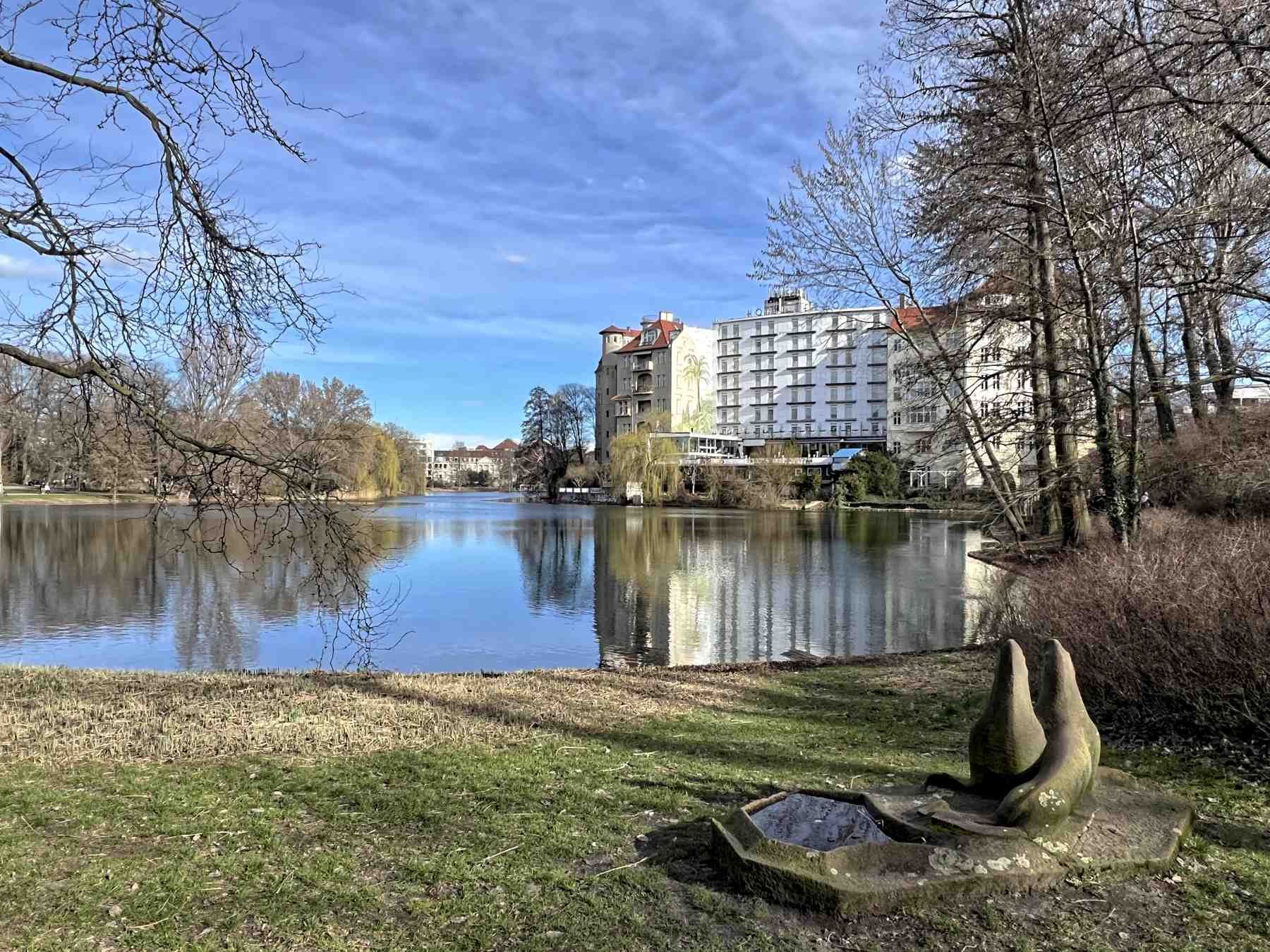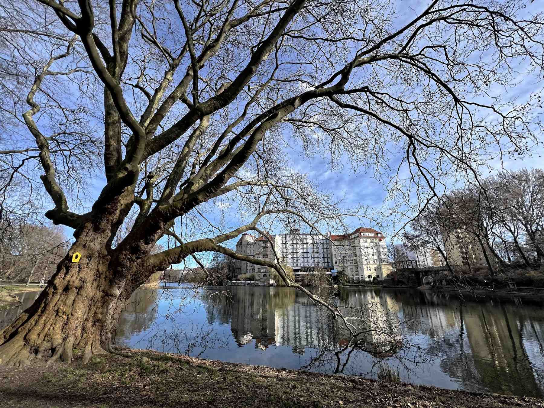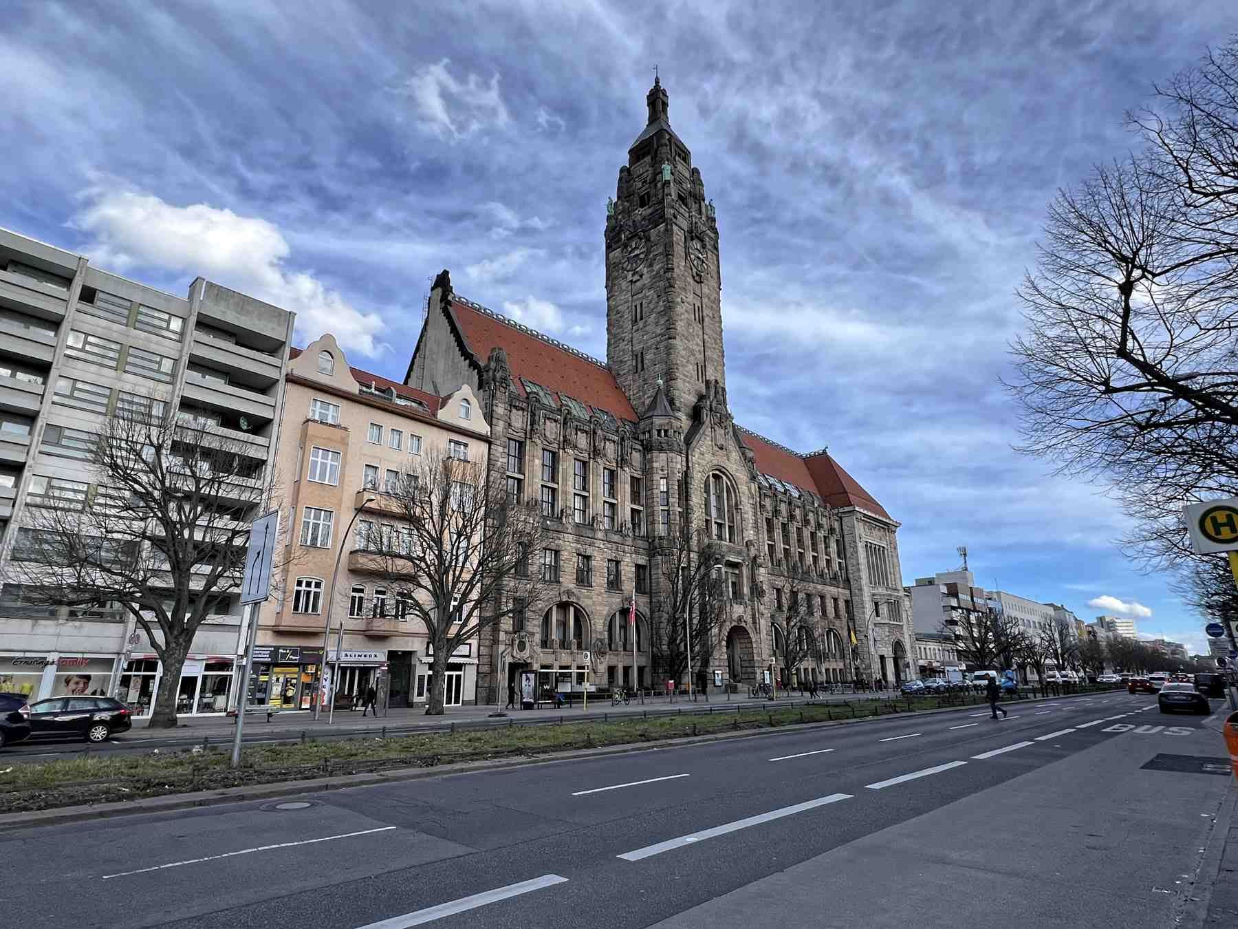 Bevor wir Schloss und Schlosspark erreichen laufen wir vom Bahnhof Charlottenburg vorbei am Amtsgericht zum denkmalgeschützten Lietzenseepark. Der sichelförmige See hat eine Fläche von 6,6 Hektar und ist drei bis vier Meter tief und wurde 1920 vom Gartendirektor Erwin Barth gestaltet. Von hier aus erreichen wir den Sophie-Charlotte-Platz von dem aus die Schlossstraße schnurgerade nach Norden zum Schloss führt. Wir genießen den Blick auf die Schlosskuppel und biegen nun zunächst in Richtung der Luisenkirche am Gierkeplatz ab und werfen anschließend ein Blick auf das Rathaus Charlottenburg.
