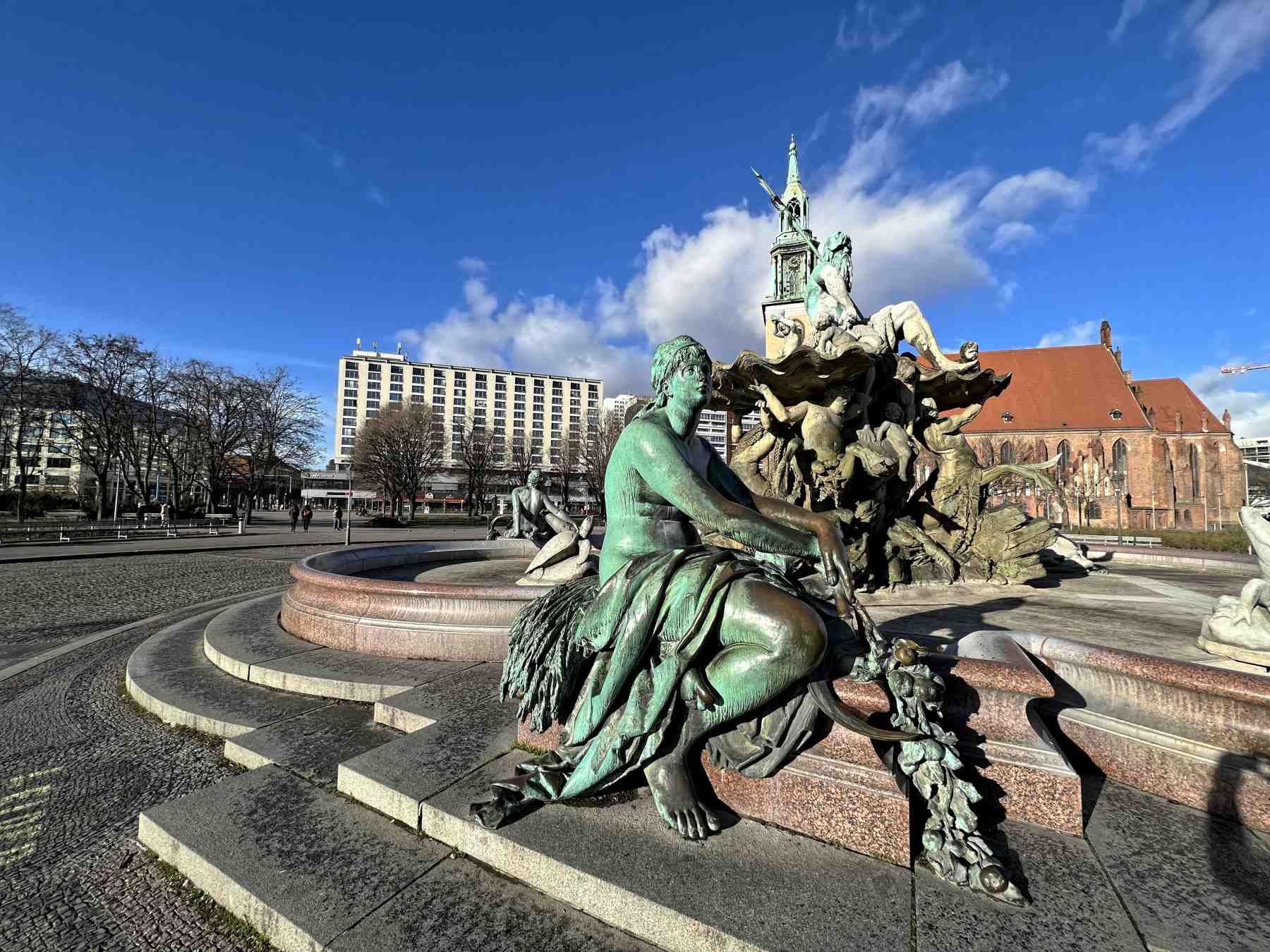 Ein Stadtrundgang im Herzen der Hauptstadt: Nach wenigen Schritten sind wir am Neptunbrunnen angeboten. Rings um uns herum sehen wir die Marienkirche, das Rote Rathaus und den markanten Fernsehturm. Es lohnt sich ein Besuch des Rathaus - im OG ist ein kostenloser Zugang möglich.