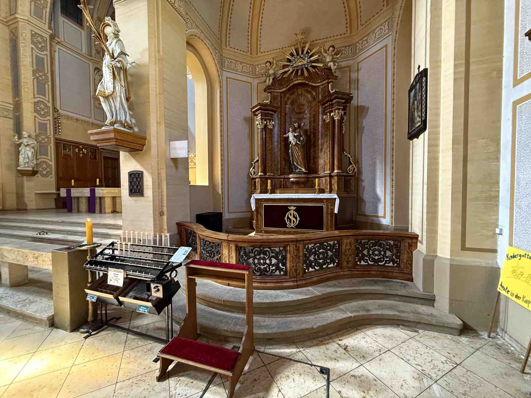 In Höhe der Stadtmühlgasse verlassen wir das Viertels indem wir rechts einen Treppenweg hoch gehen. Hier erreichen wir wieder die Hauptstraße. Rechts um runden wir einen kleinen Platz und gehen links bis zum Abzweig zur Obergasse. Diese führt uns zur Kirche St.-Laurentius, welche zum Besuch geöffnet ist.