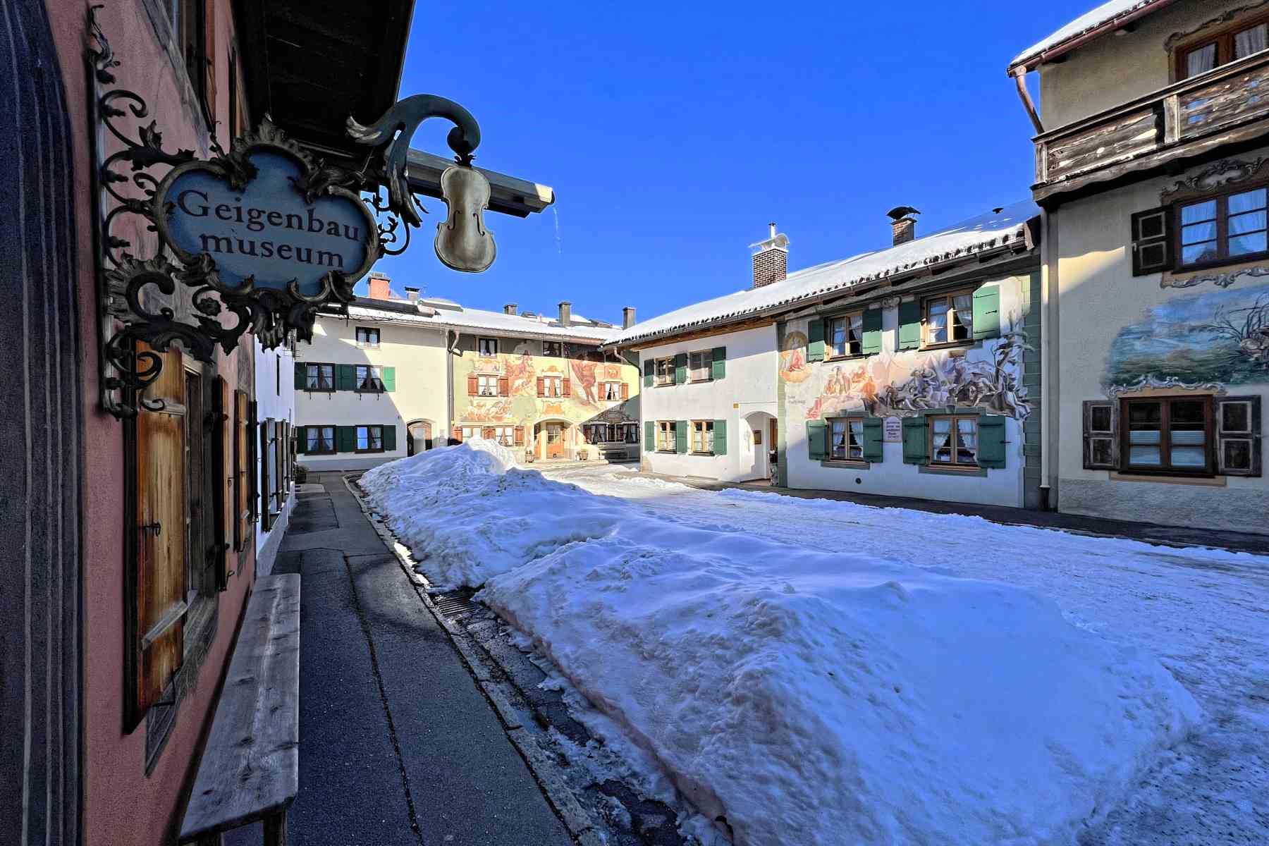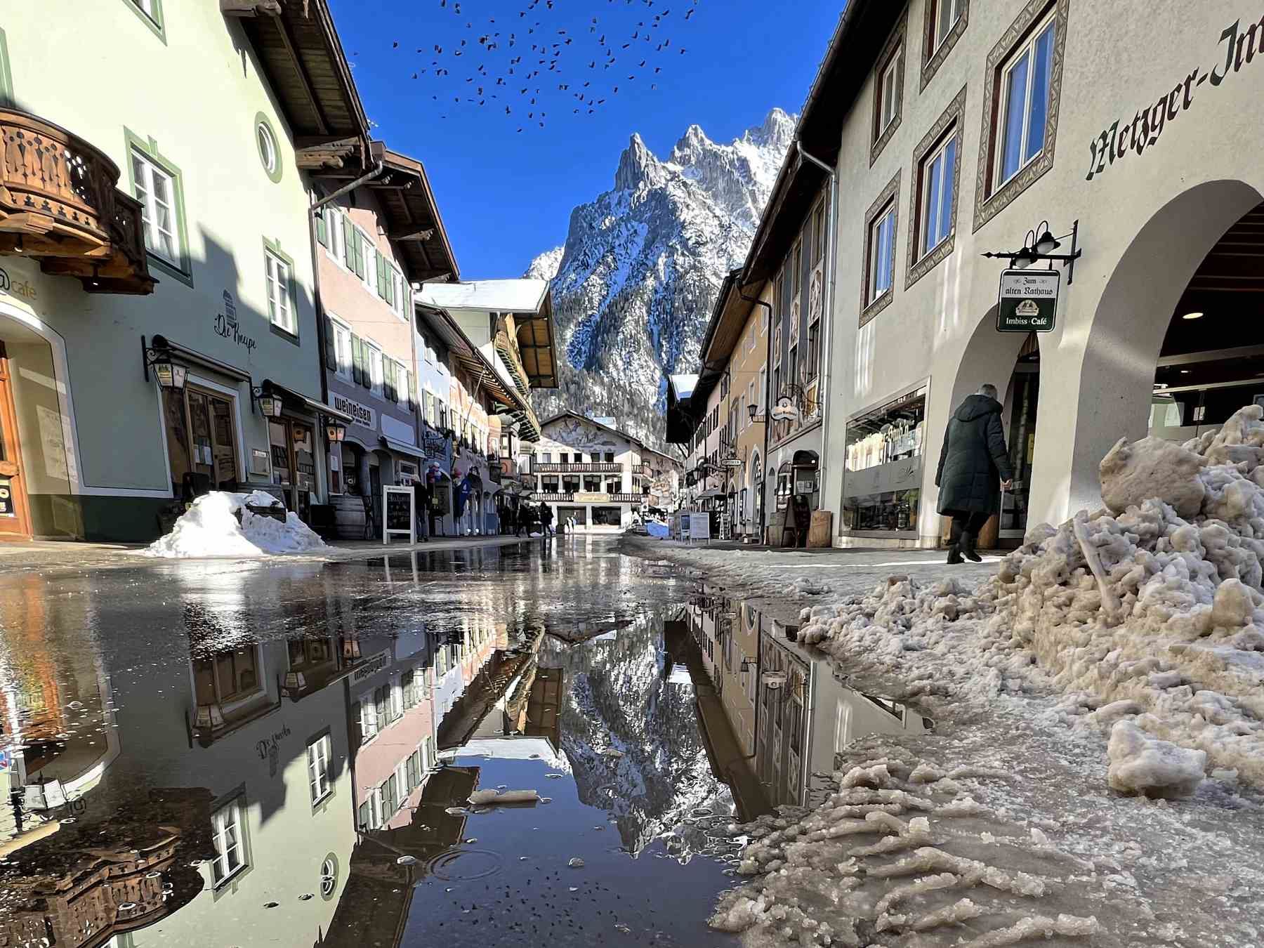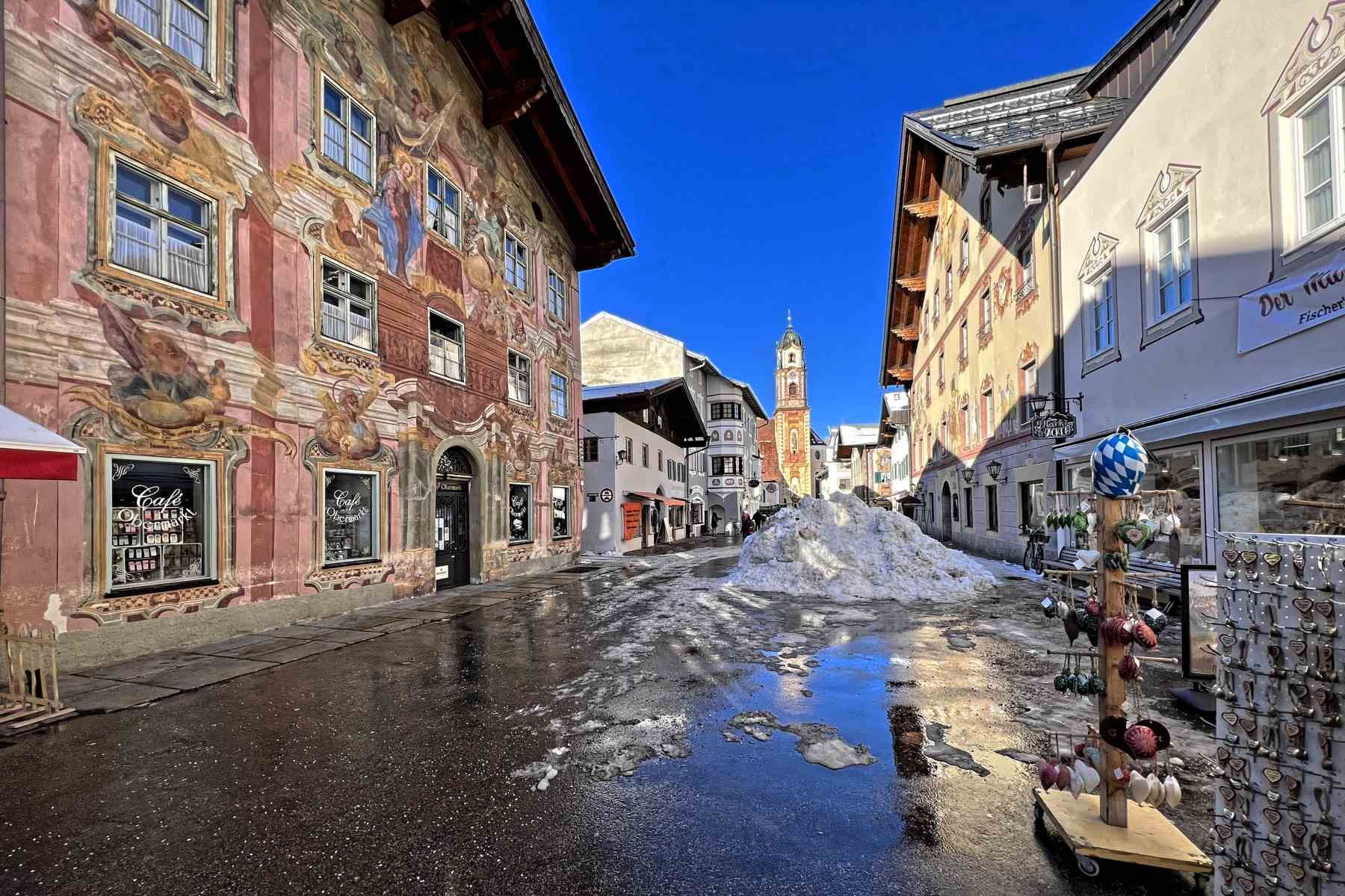 Nach dem Schnee kam die Sonne: Impressionen von den motivträchtigen Plätzen und Straßen in Mittenwald: Obermarkt, Ballenhausgasse und Im Gries.