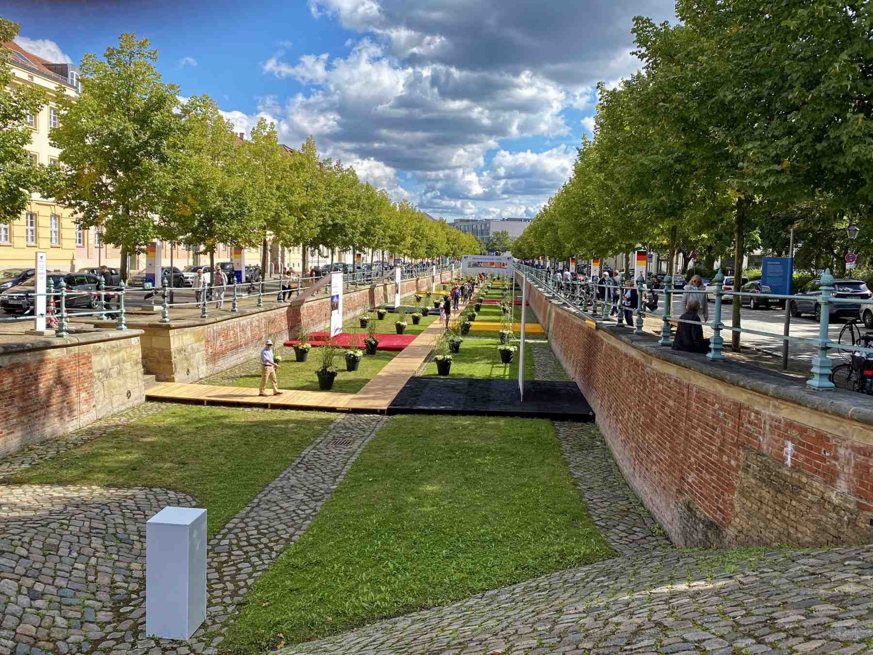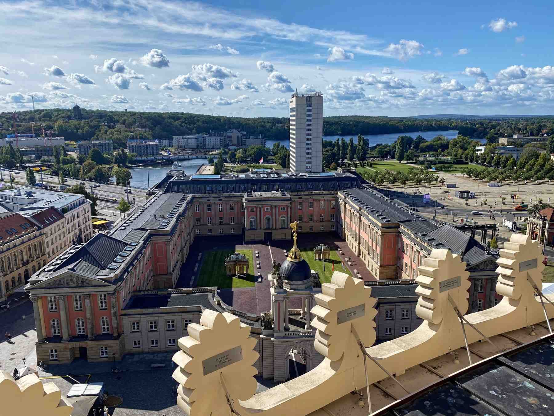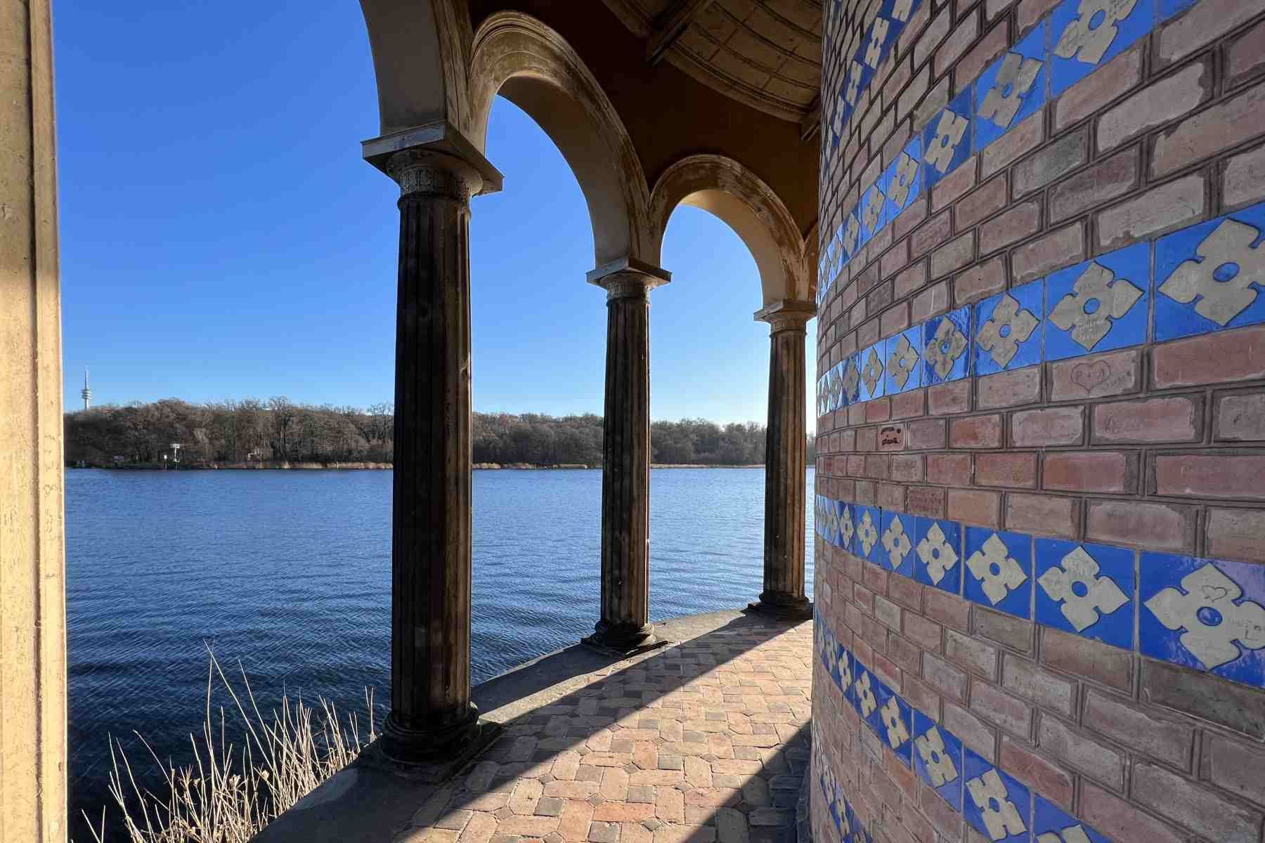 Wir halten uns rechts und erreichen das Schloss Charlottenhof. Entlang am Maschinenteich zu den Römischen Bädern, weiter zum China Haus. Wir folgen der Hauptallee bis zum Neuen Palais. Anschließend durch den Hopfengarten zum Drachenhaus mit Abstecher zum Bellvedere auf dem Schlossberg.