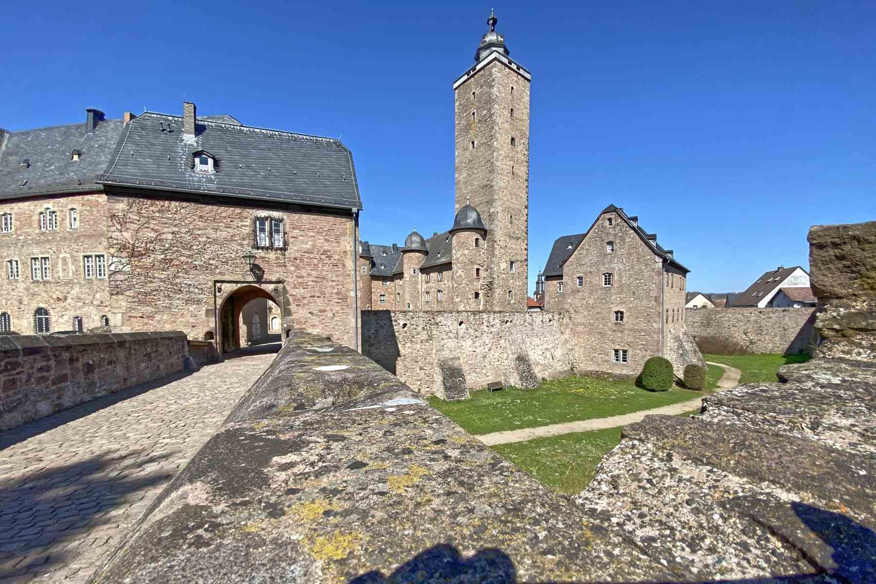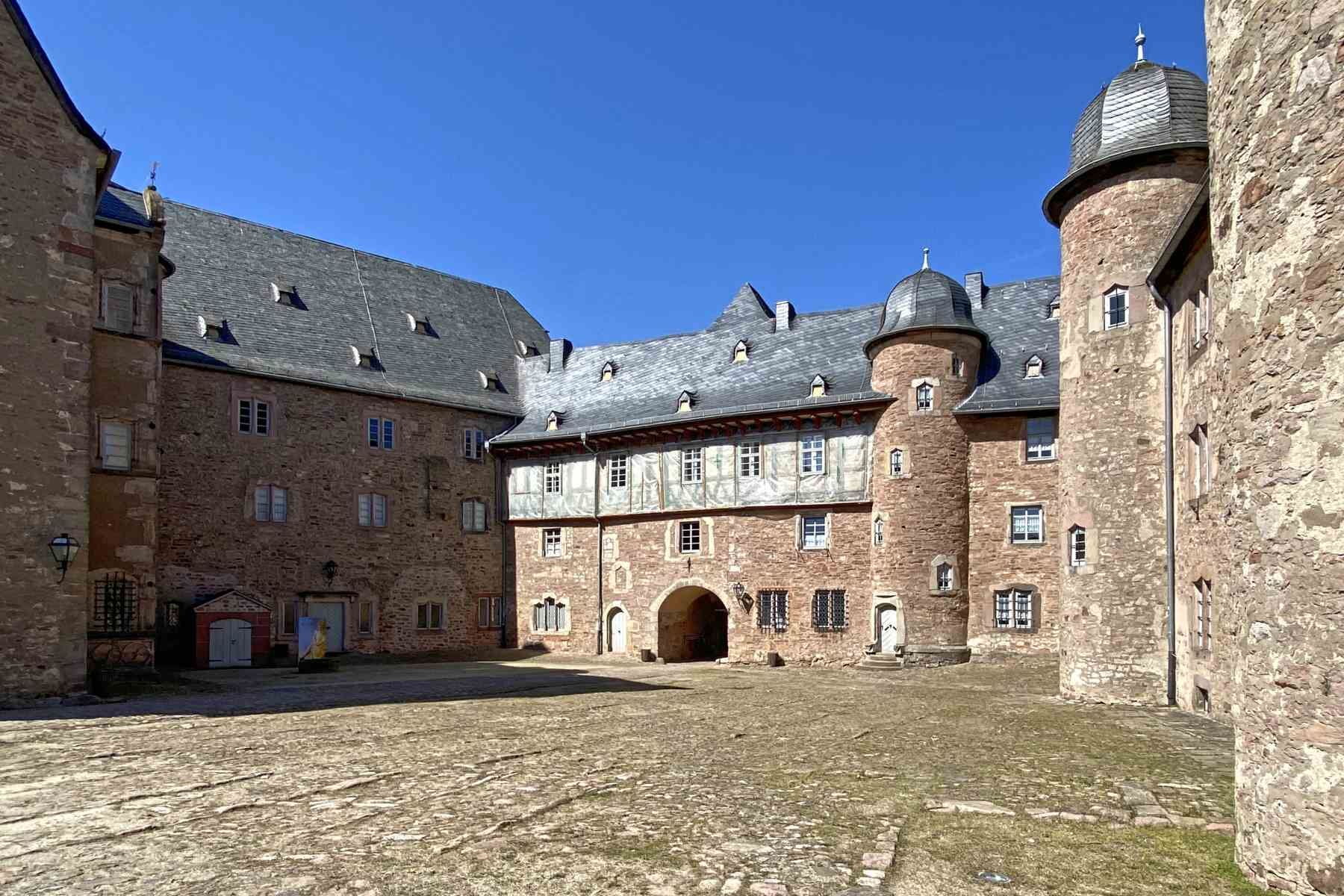 Direkt in Rathausnähe steht das eindrucksvolle Schloss Steinau, welches eine der am besten erhaltene Schlossanlage der Frührenaissance in Hessen ist. Das Schloss ist fünfeckig angelegt, eine Mischung aus mittelalterlicher Burg, Schloss und Festung.
