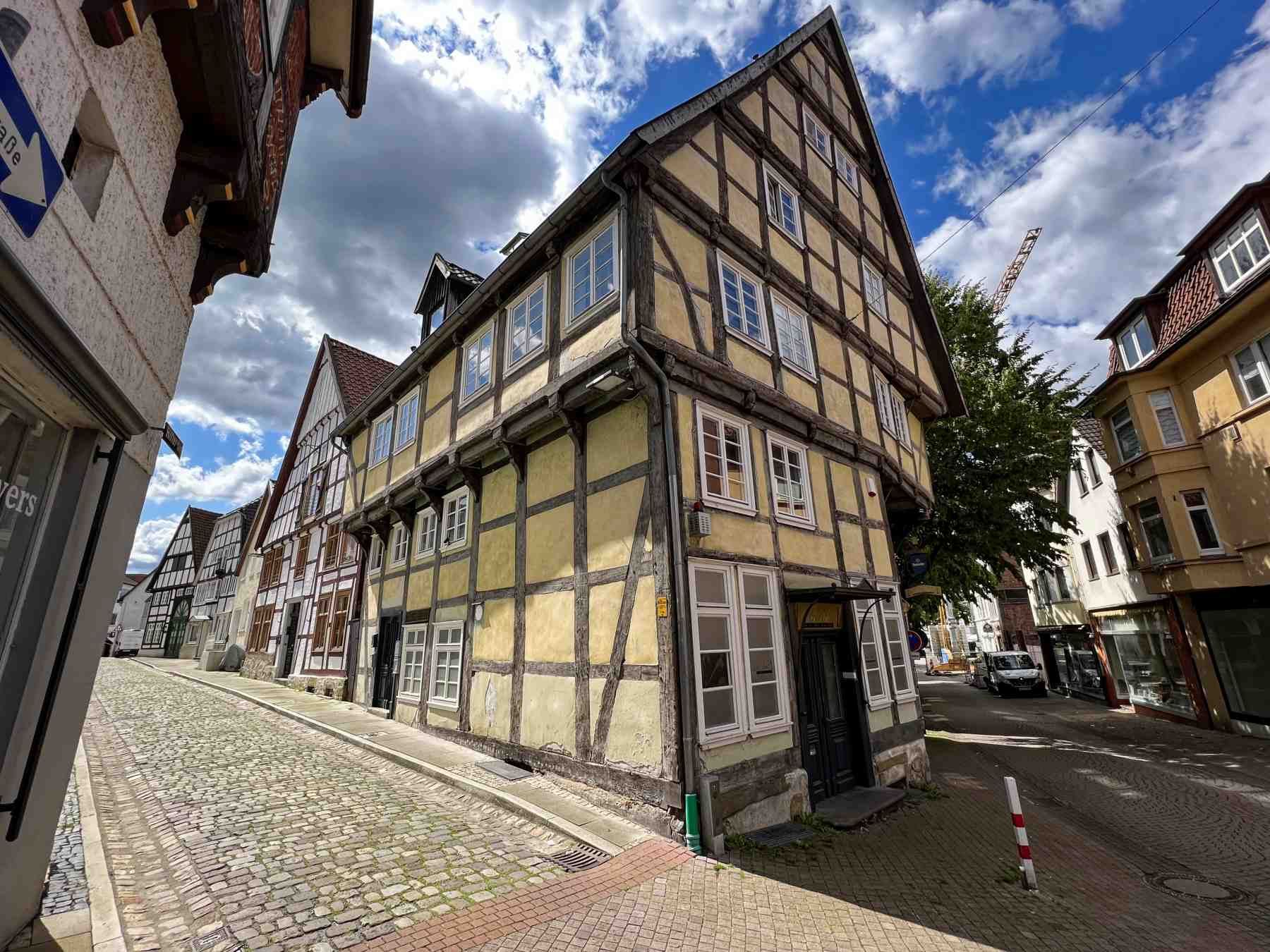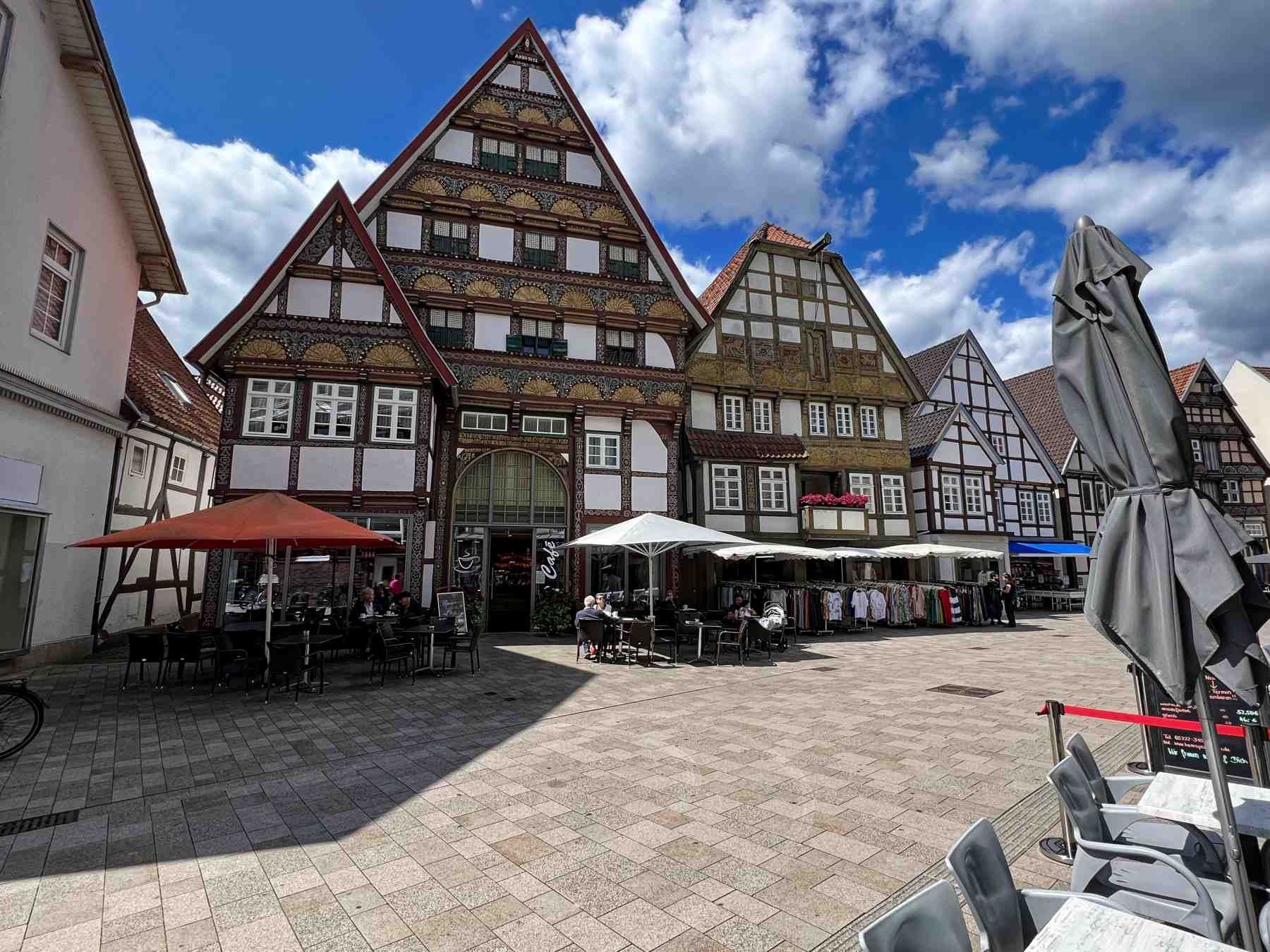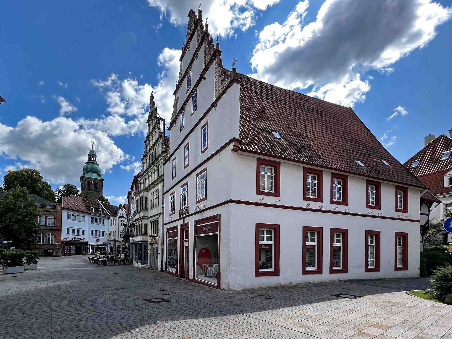 Bereits im Mittelalter war die Stadt durch die örtliche Salzgewinnung reich geworden, dieses spiegelt sich in den sehr aufwendig verzierten Fachwerkhäusern wieder. Hierbei handelt es sich zu meinst um giebelständiger Fachwerkbauten aus dem 16. und 17 Jahrhundert. Eines der besonders hervorragend noch erhaltenen Weserrenaissance-Ensembles in Ostwestfalen steht in der Fußgängerzone in der Langen Straße 5 bis 9.