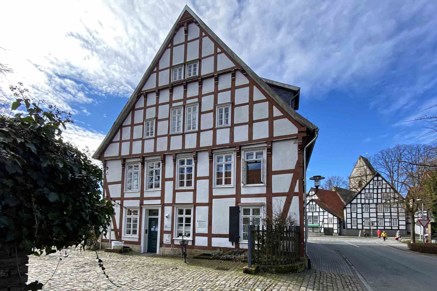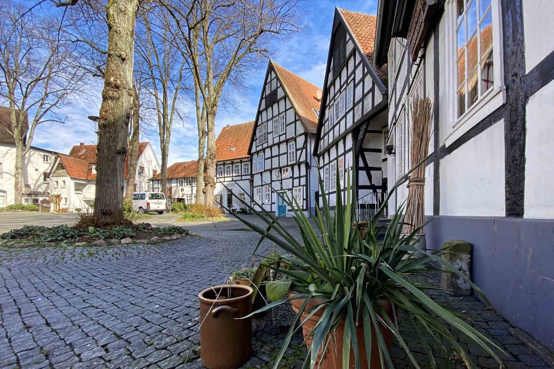 Die Hauptattraktion der westfälischen Stadt ist das Haller Herz : Ein Ring von typisch westfälischer Fachwerkhäuser umsäumt den Kirchplatz.