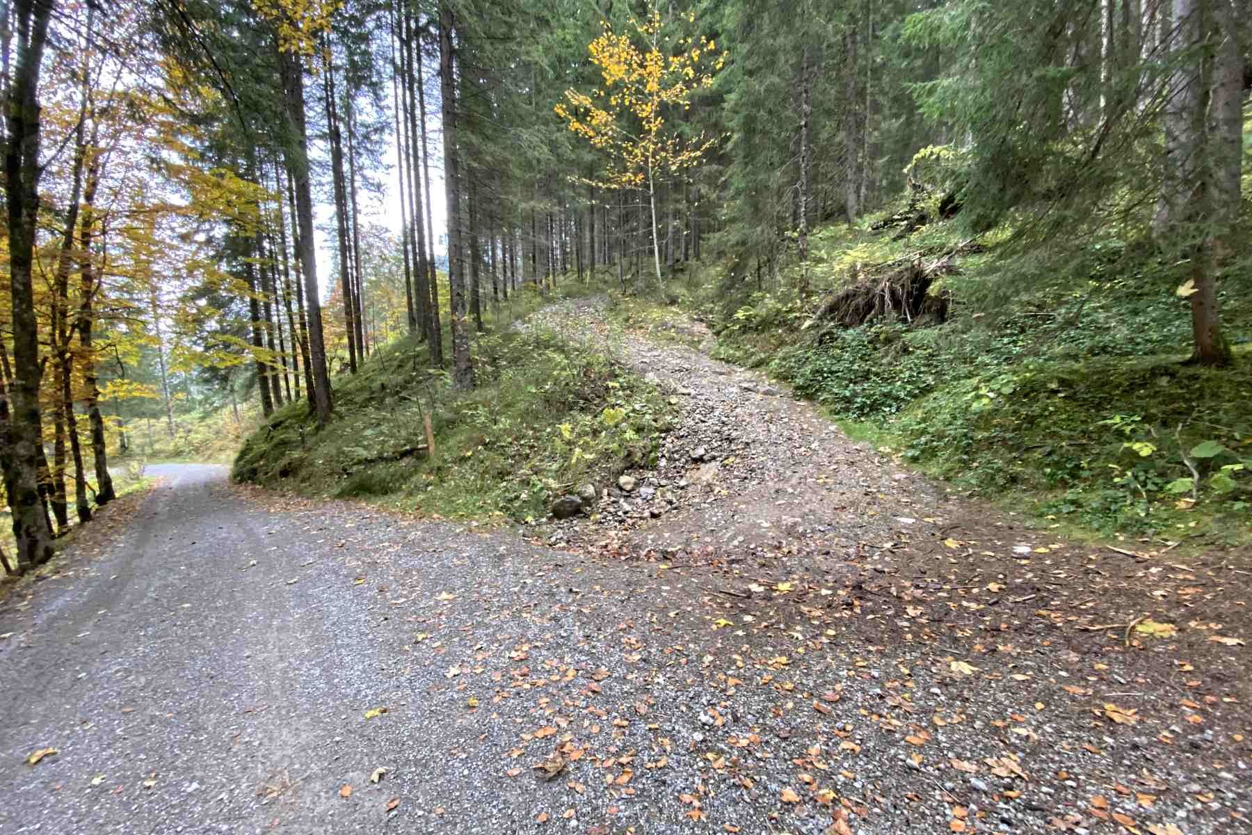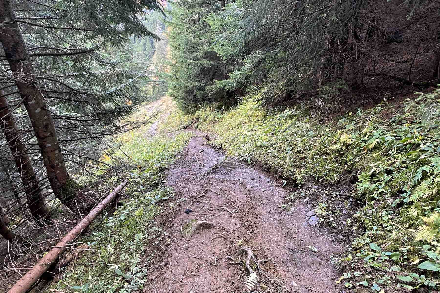 Nach dem Aufbruch von der Alpe müssen wir uns etwas orientieren, da es keinen gut ausgetreteten Pfad in Richtung des Bergwaldes gibt. Wir gehen einfach über die Wiese in südliche Richtung zum Waldeand. Hier treffen wir auf einen ausgetretenen Pfad. Heute war es nur etwas feucht, dennoch war es sehr rutschig und matschig zu gehen. Der Weg uns direkt, teils in Serpentinen direkt nach Einödsbach.