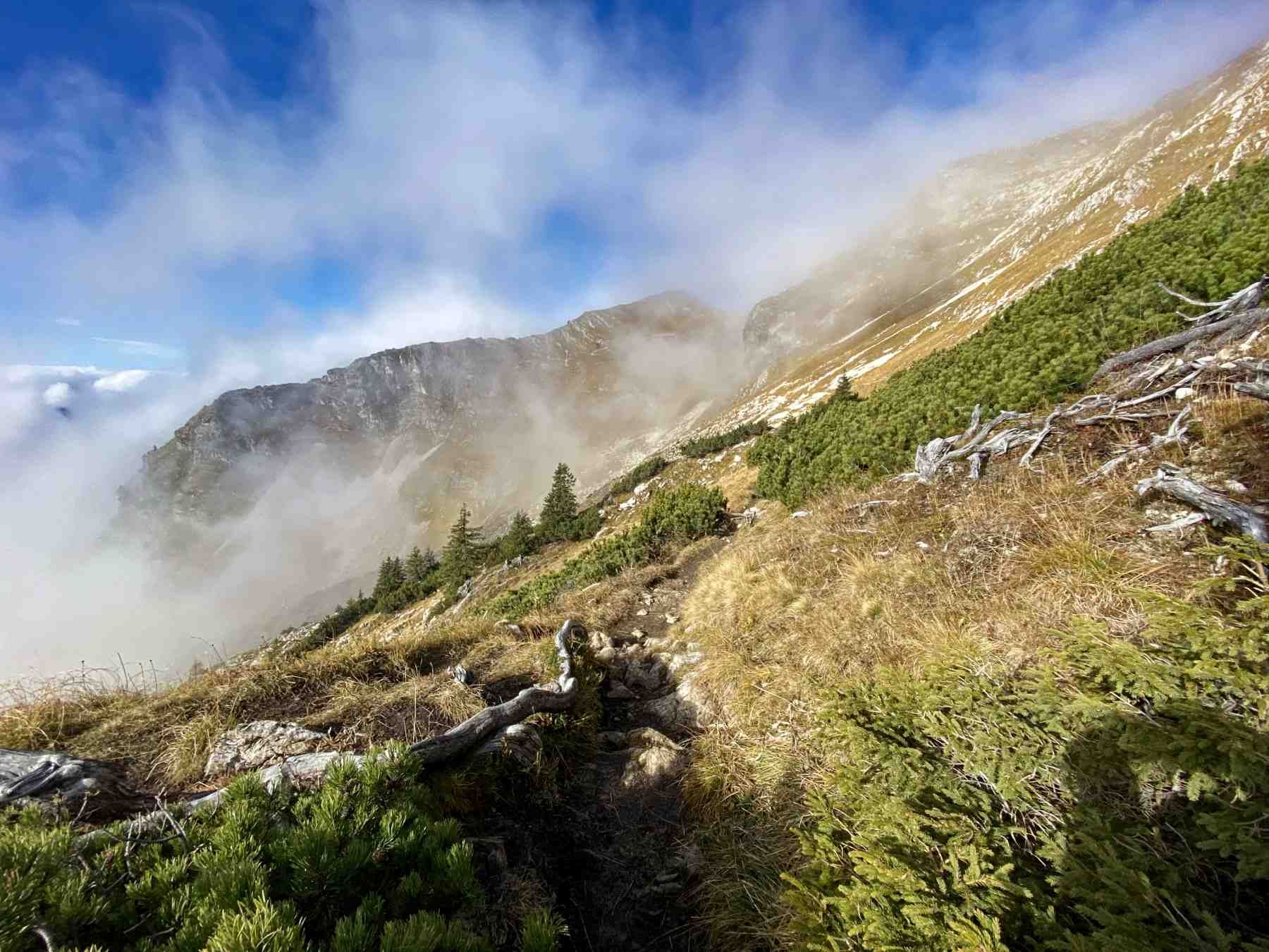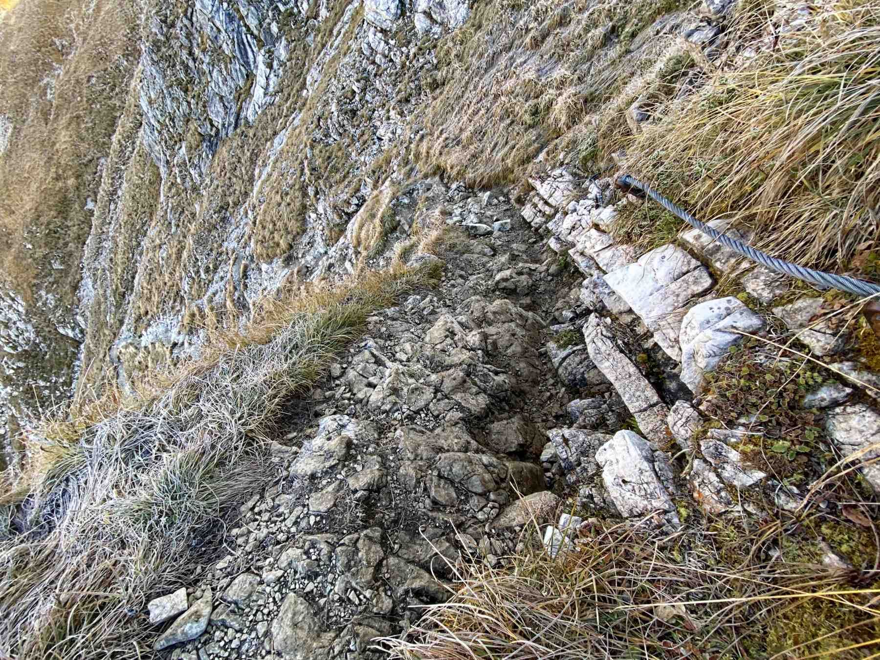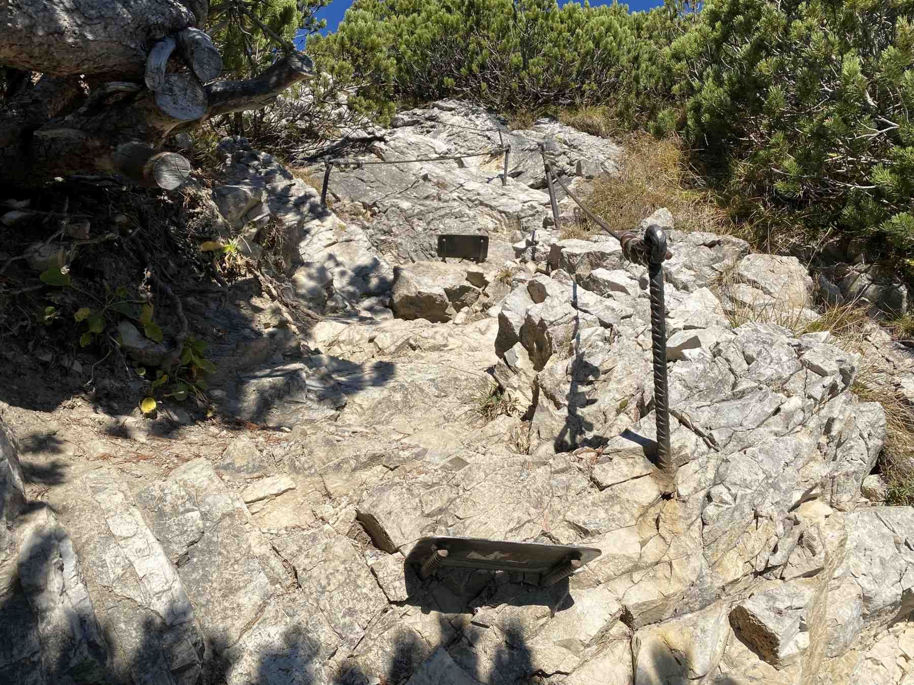 Diesen breiten Panoramaweg verlassen wir bereits am nächsten Wegweiser. Wir zweigen nach rechts auf einen schmalen Pfad ab. Wir wandern jetzt etwa 10 Minuten leicht bergab - erreichen drahtseilversicherte Abschnitte, welche Trittsicherheit erfordern - im weiteren Verlauf folgenden kann keine versicherten Passagen mehr.