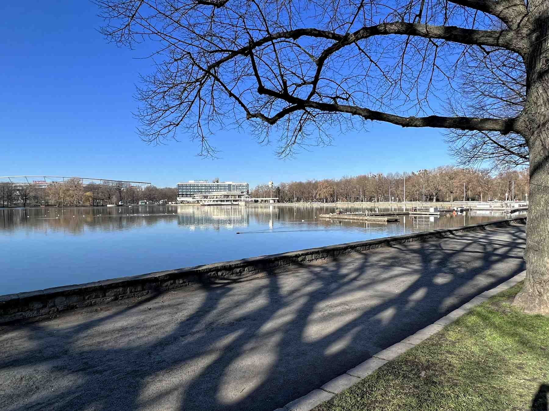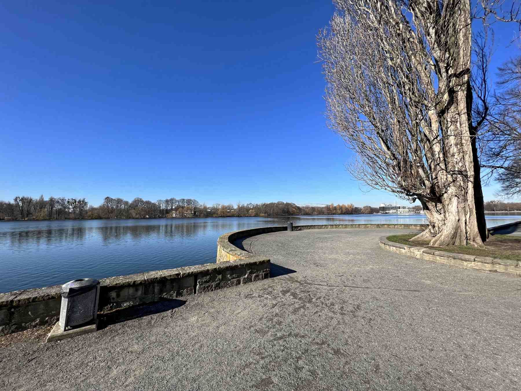 Vom Biergarten oder wenn wir gleich geradeaus weitergehen stoßen wir direkt auf die Heinz von Heiden Arena, vielen sicher noch bekannt als Niedersachsenstation. Wir haben jetzt das Nordufer und das Ende des Rundweges erreicht.