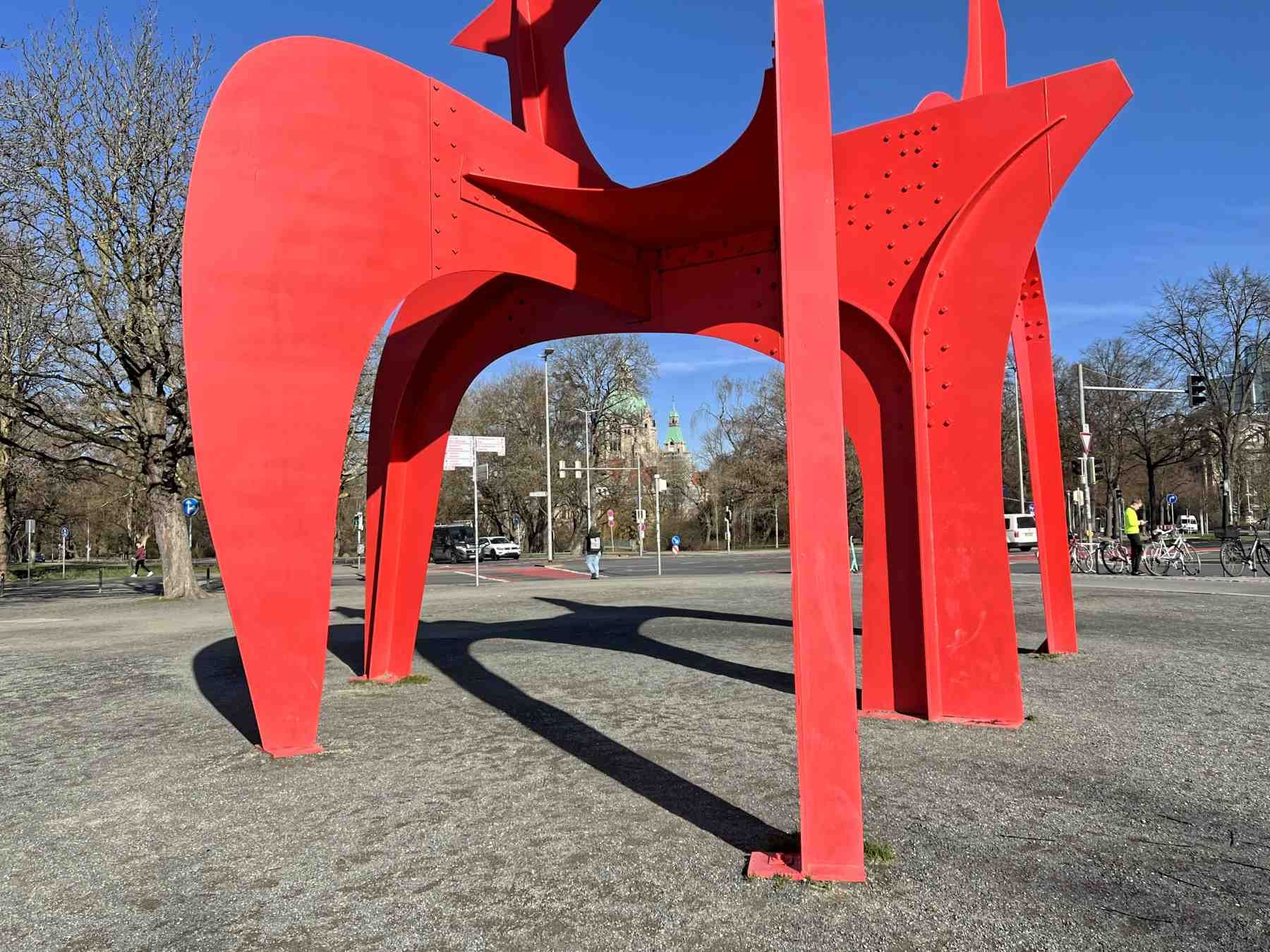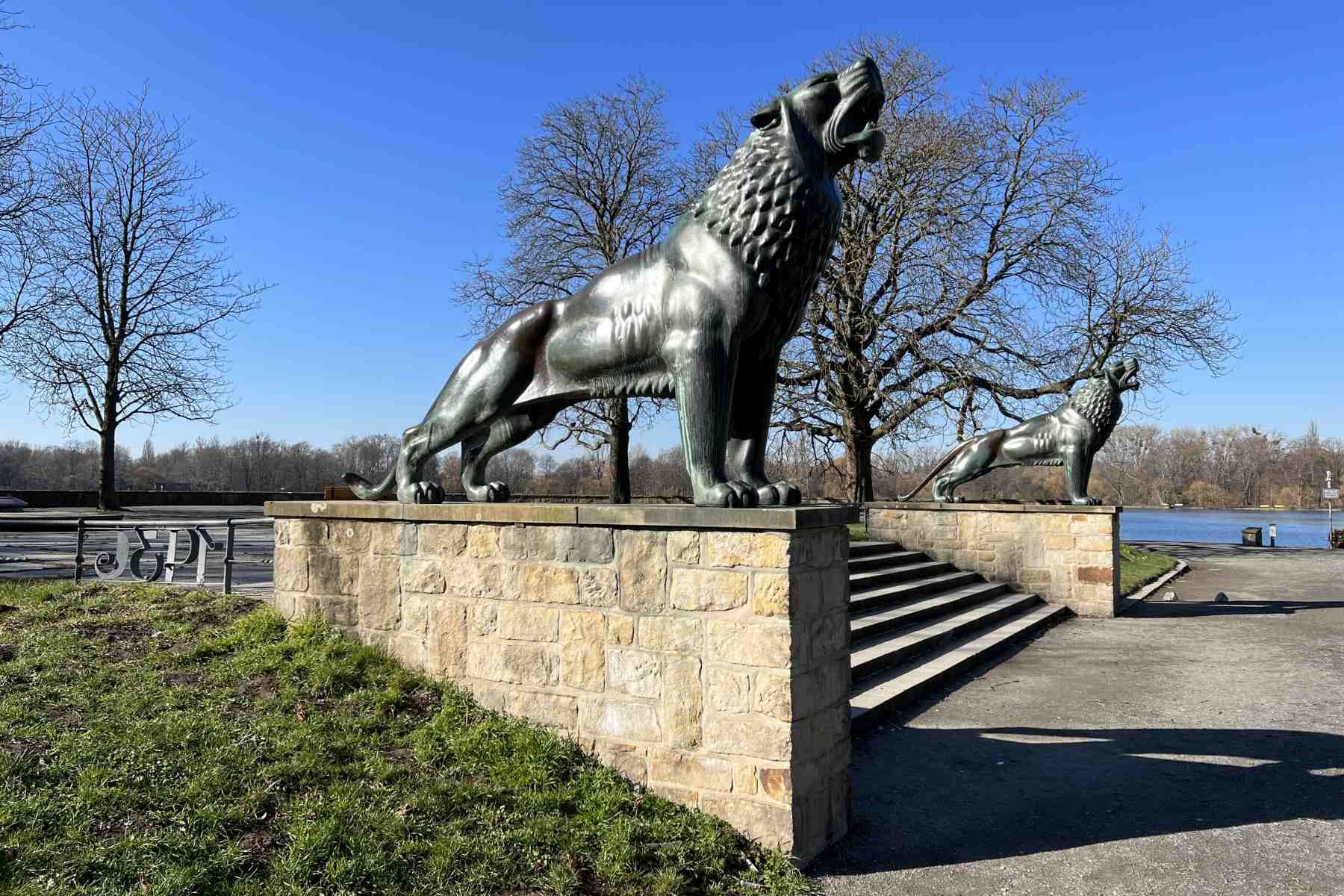 Der Ostuferweg führt schnurgerade gen Süden und wird jedes Jahr auch als Teilstrecke des Hannover Marathons abgelaufen. Wir kommen an Schiffsanlegestellen und der Geibelbastion sowie der Löwenbastion mit seinen zwei Löwen-Skulpturen des Bildhauers Arno Breker vorbei.
