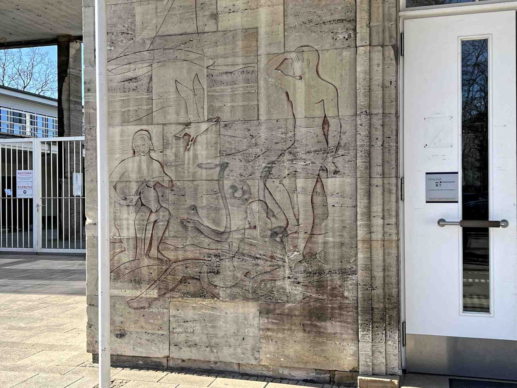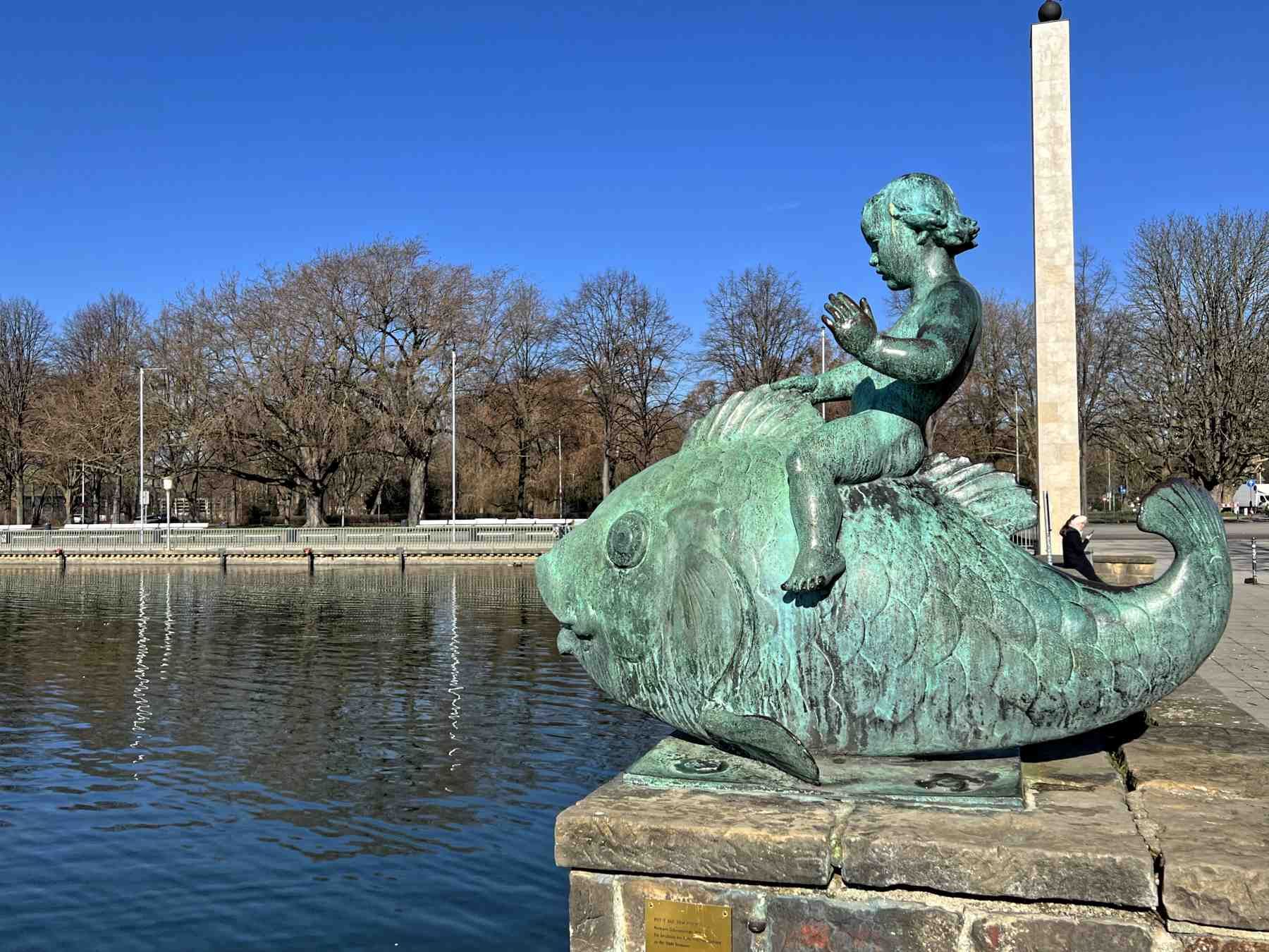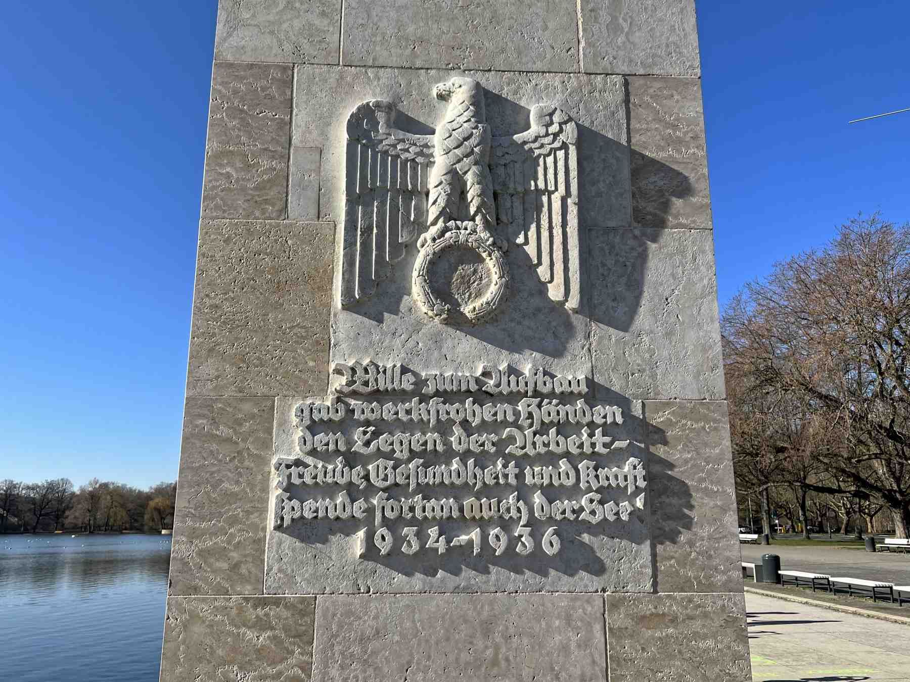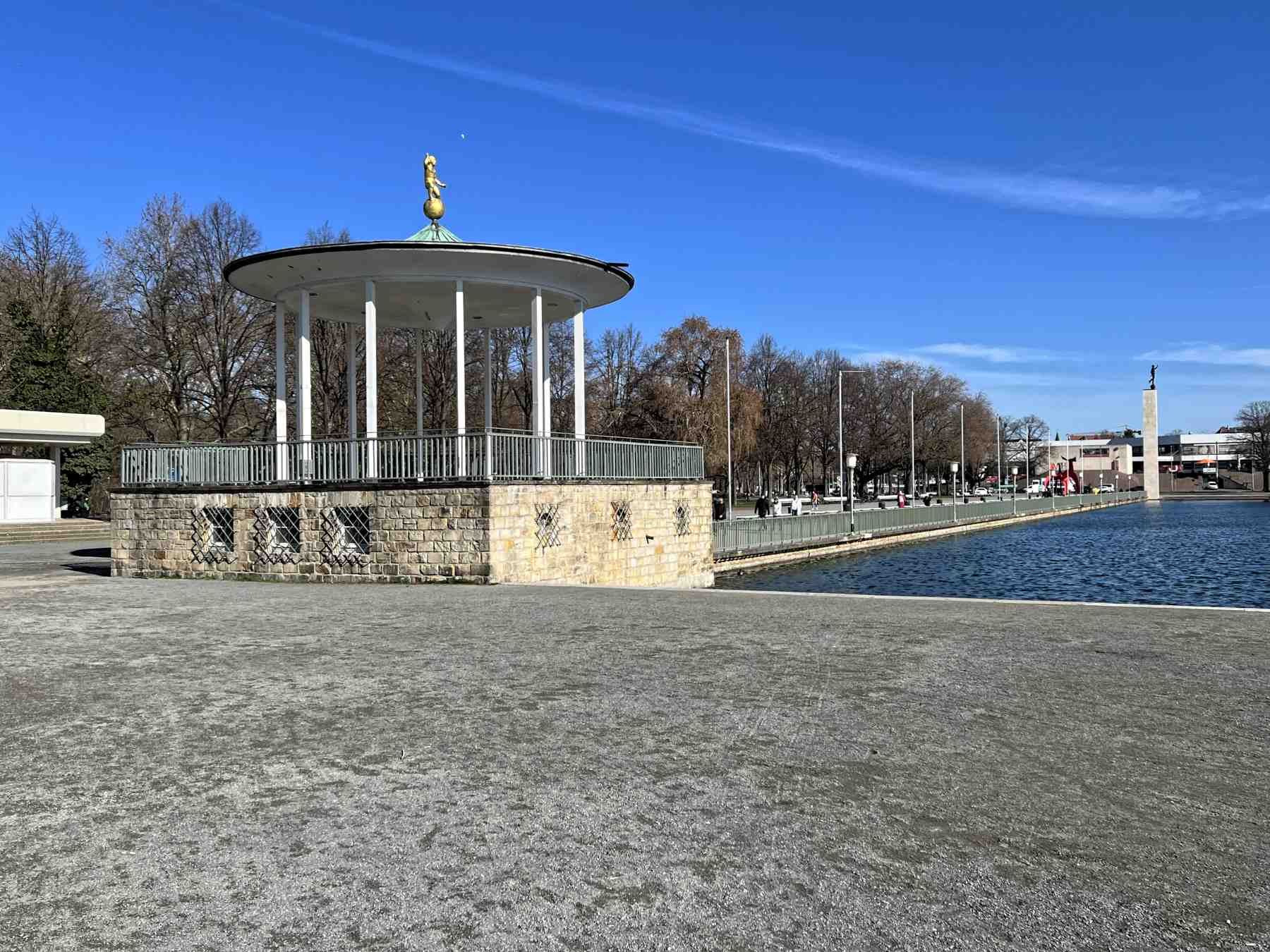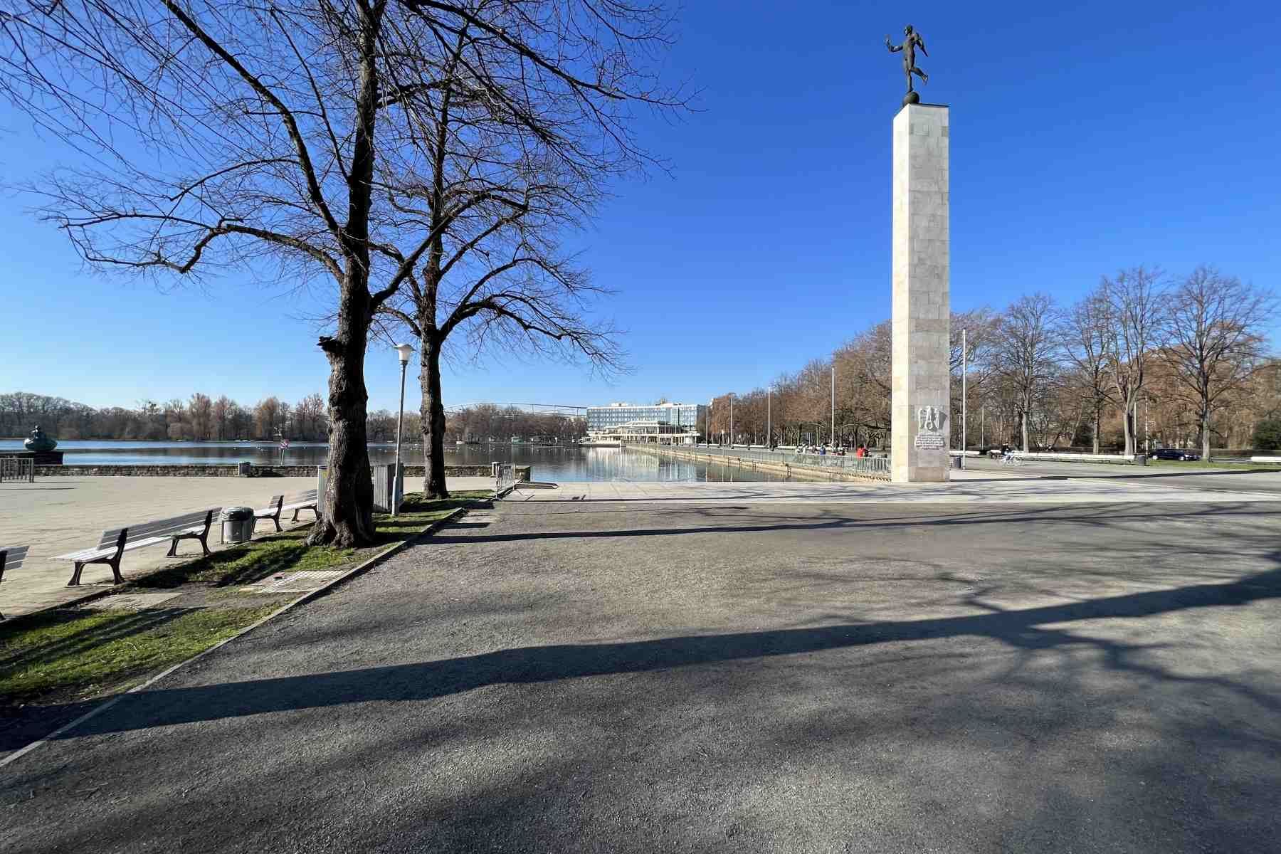 Wir starten nun die etwa 1 ½ stündige Umrundung des Maschsees. Am Startpunkt steht aus der nationalsozialistischen Zeit die Säule mit dem Fackelträger und linkerhand steht das Sprengel-Museum für moderne Kunst.