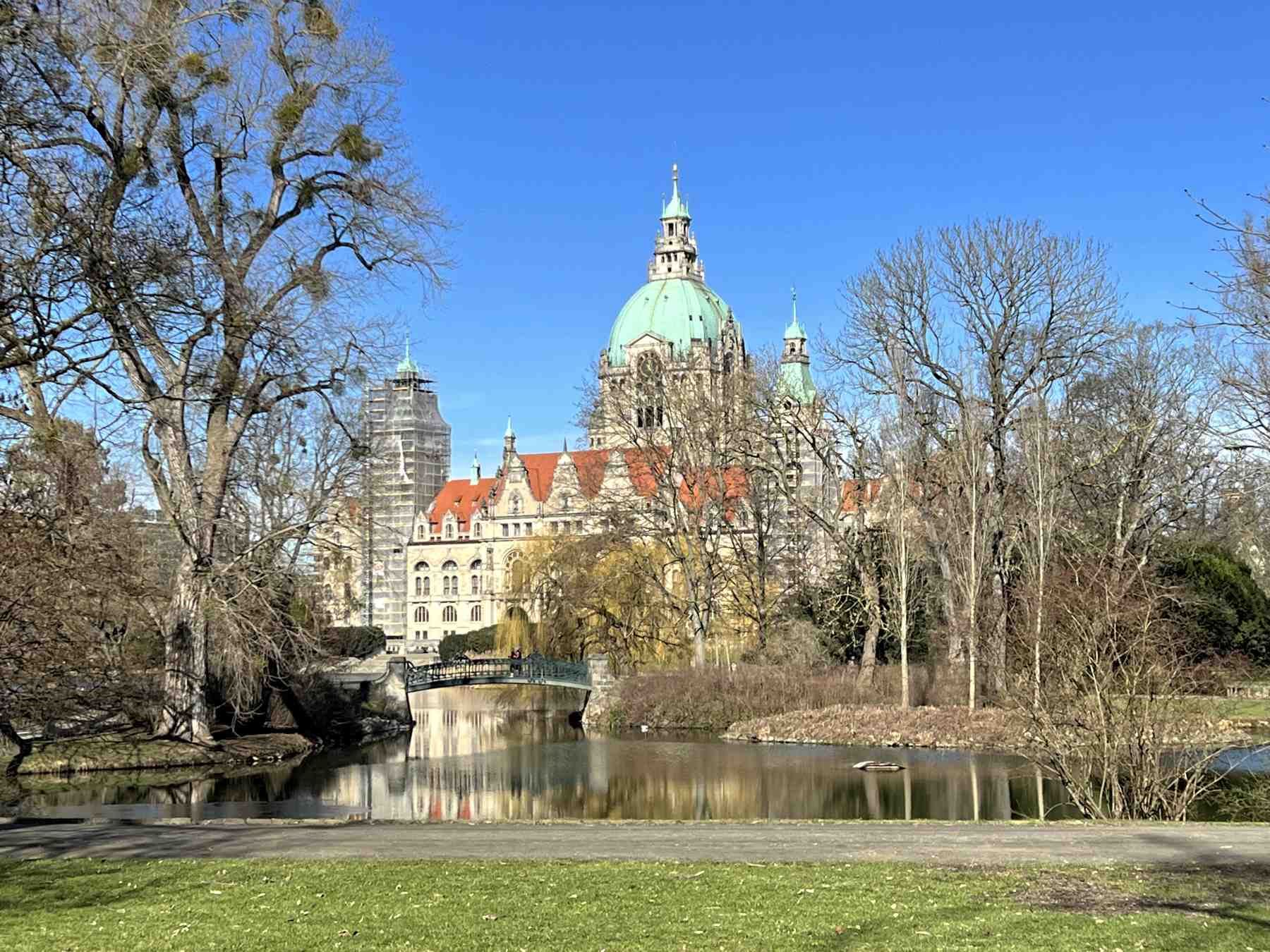 An der Rückfront des Neuen Rathaus liegt der auch künstlich angelegt Maschteich, auf dessen Oberfläche sich die Südseite des Rathaus fotogen spiegelt.