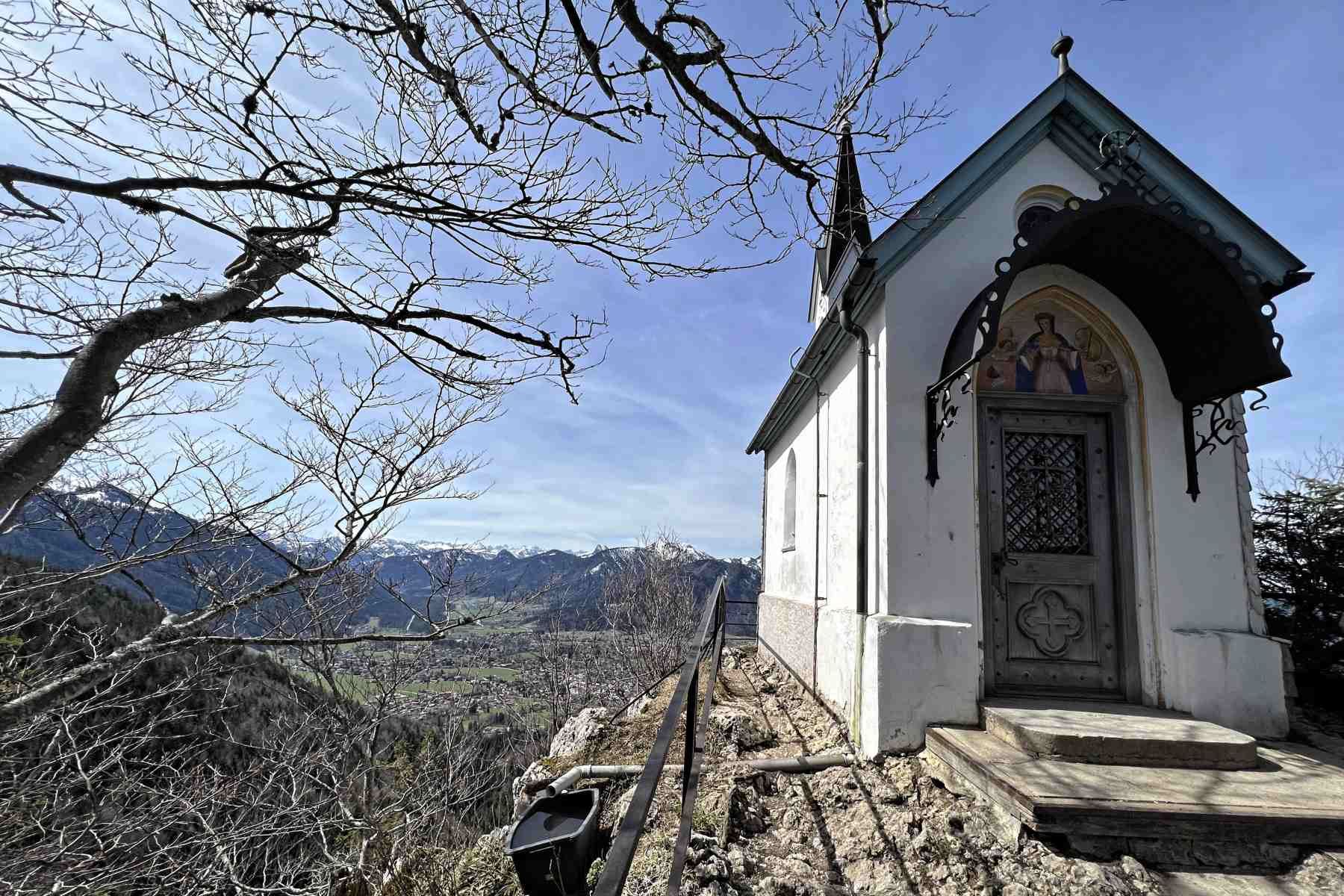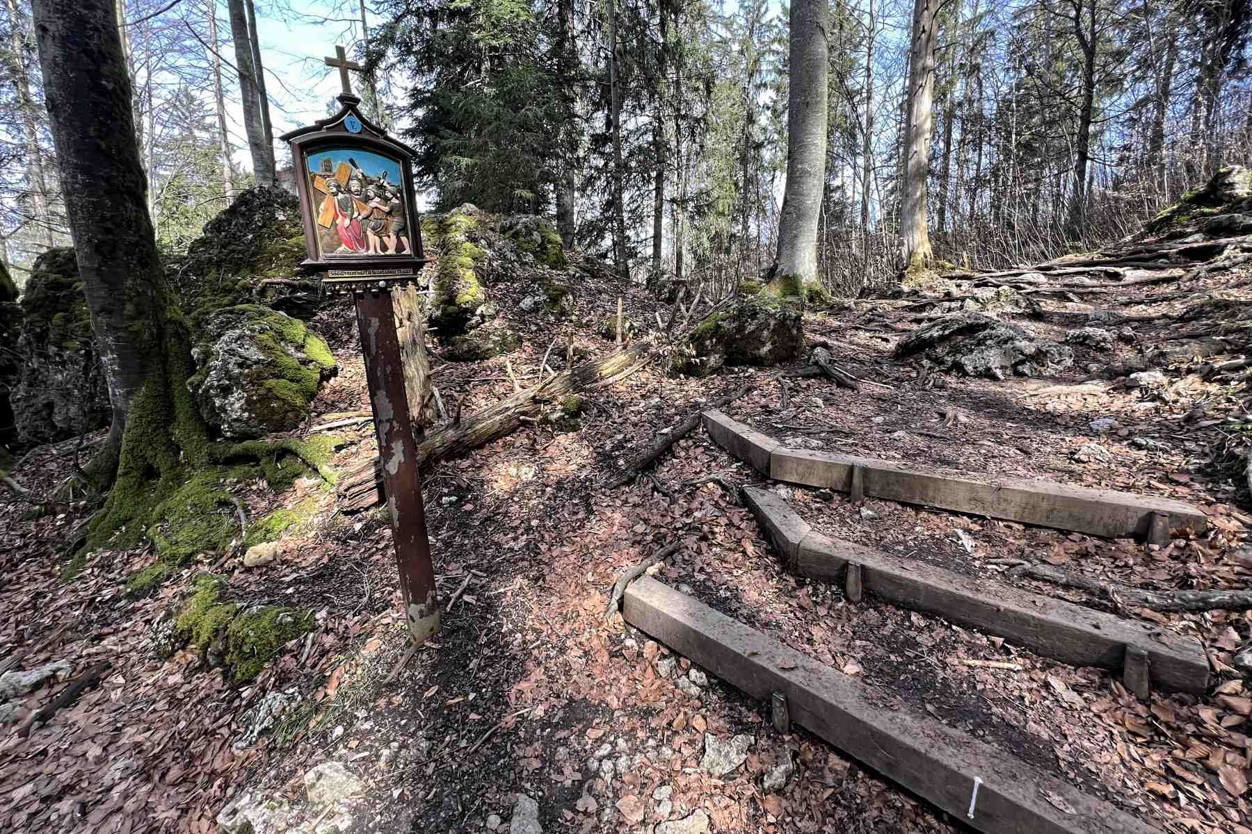 Nur wenige Meter hinter dem Gasthaus biegen nach nach links in den Wald ab um auf den Riedenstein zu wandern. Zum Gipfel führen zwei Wege: Zum einen der leichte Weg und der Kreuzweg. Dieser führt hauptsächlich über Holzstufen und entlang des Weges stehen 14 Tafeln, die den Leidensweg Christi beschreiben.