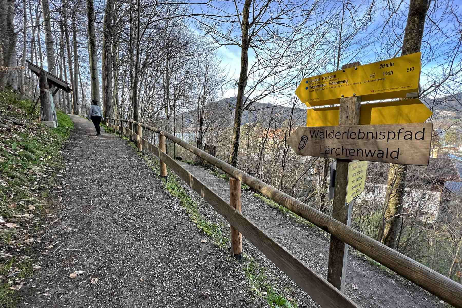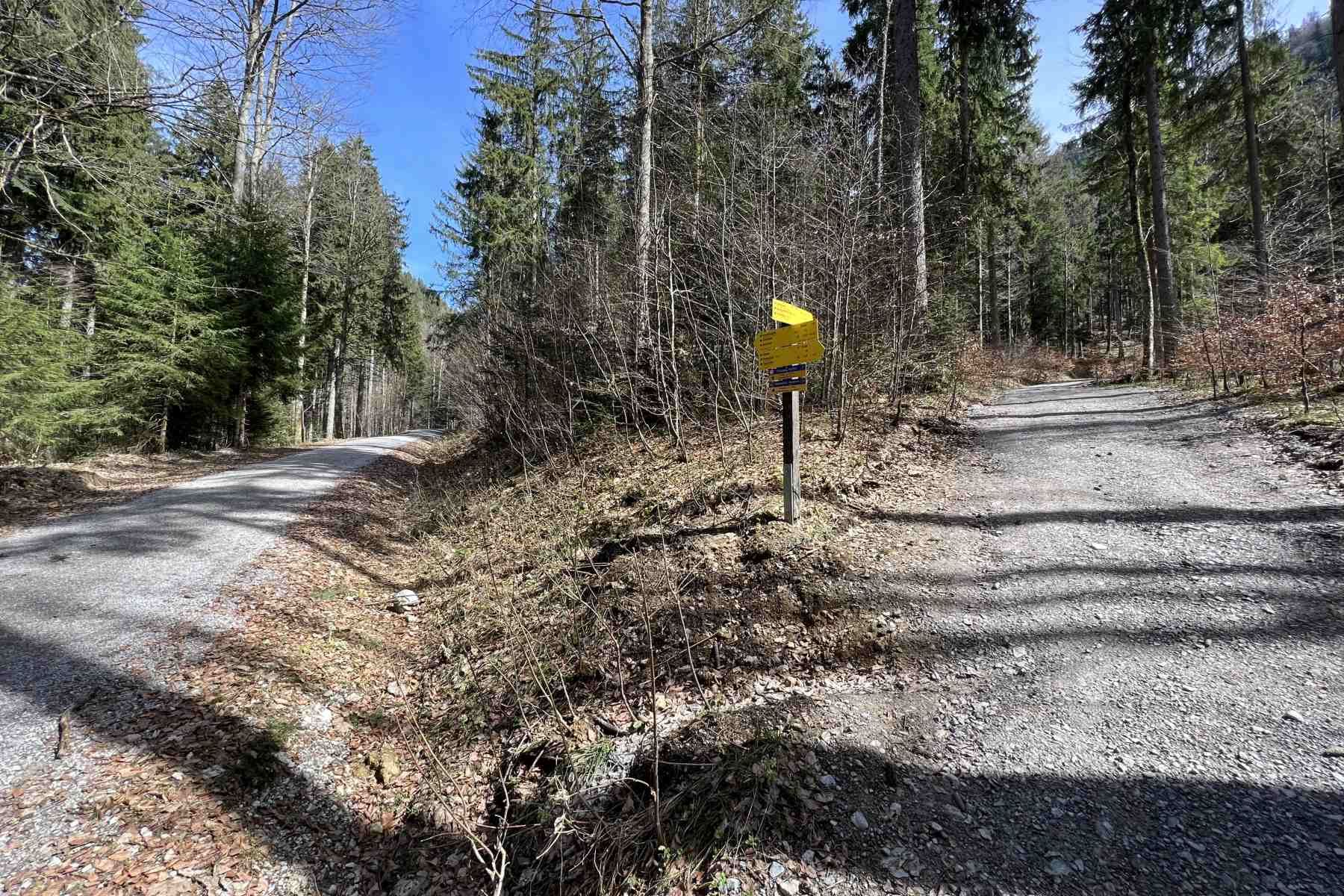 Vom Bahnhof aus gehen wir auf der Bahnhostraße Richtung Ortszentrum. Nach dem Überqueren des Alpbaches biegen wir in die 2. Straße nach links in die Lärchenwaldstraße ab. Anschließend zweigen wir in die nächste Straße (Am Brand) nach rechts ab. Nach wenigen Metern zweigt in der Linkskurve der Wanderweg rechts ab.