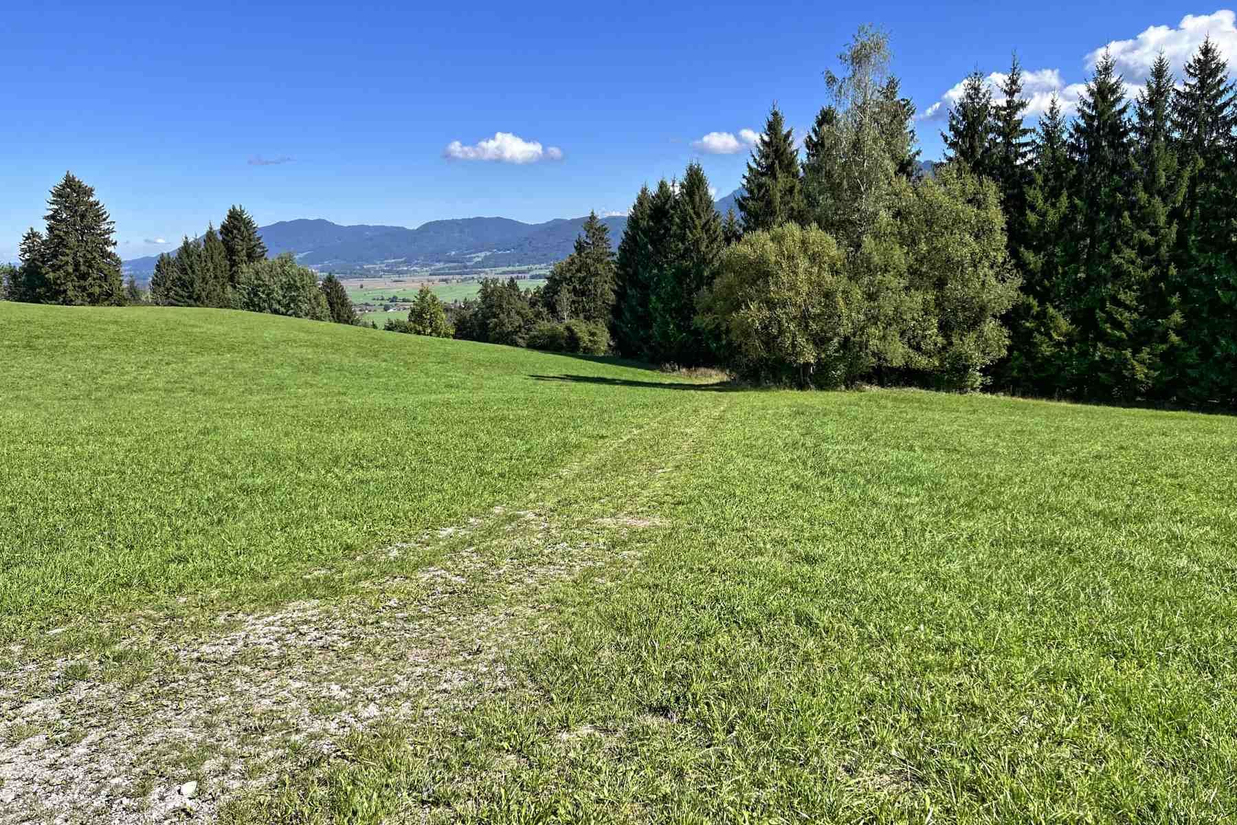 Der Weg führt uns durch mehrere Weidegitter. Unterwegs haben wir immer wieder mal einen Blick auf die Türme der Klosterkirche in Schlehdorf, diese bieten eine gute Orientierung in welche Richtung unser Ziel liegt.