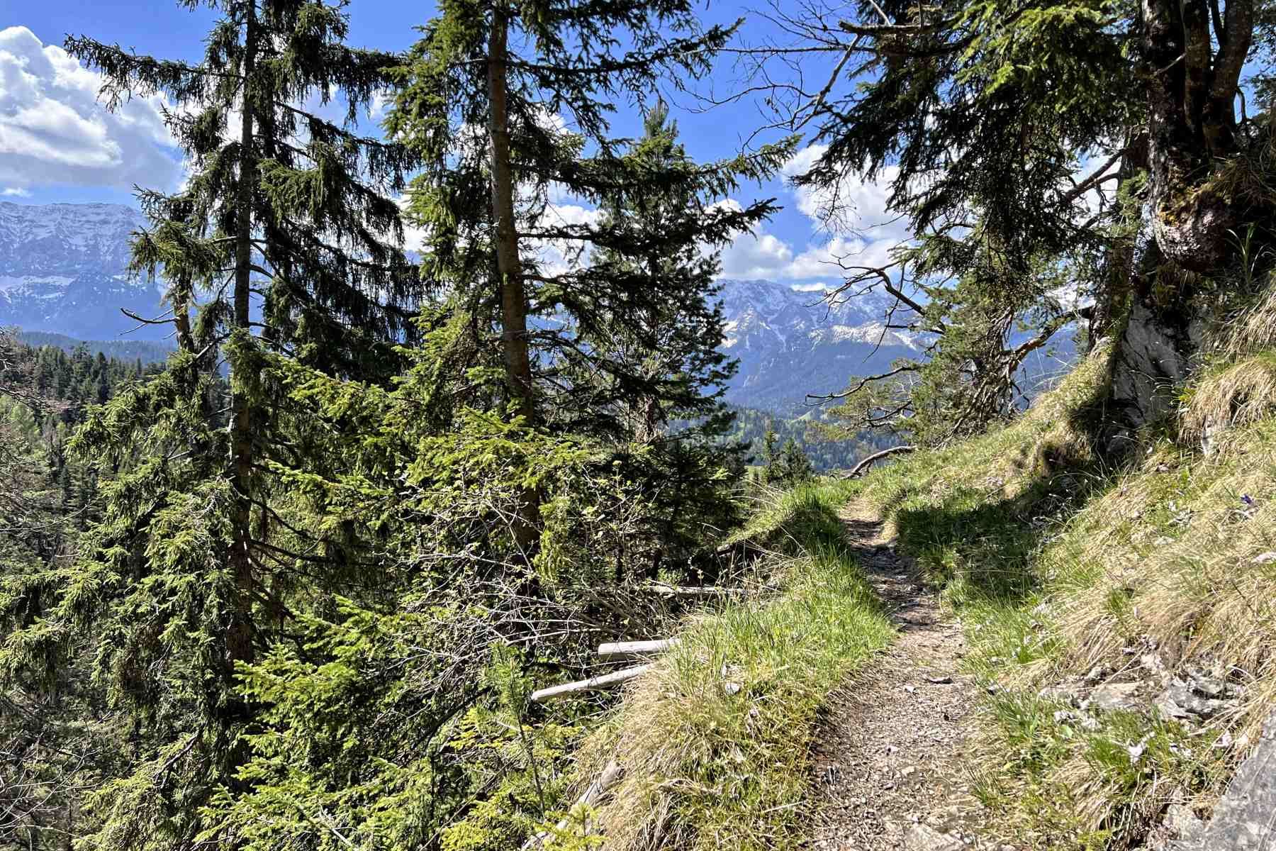 Hinter dem Gasthof folgt man anschließend NICHT den Wegweiser Partenkirchen sondern nimmt den Pfad hinter dem Wegweiser der steil bergauf führt. Nach einer kurzen Wegstrecke zweigt man Richtung Tannenhütte ab. Es geht nun weiter auf einem Pfad bergauf. Im Verlauf überquert man eine Freiweide und ca. 10-15 min danach führt ein nicht ausgeschilderter Weg rechts ab. Diesen Pfad geht man bis zum Ende wo man auf den Wanderweg Wank Talstation - Wand Mittelstation stößt. Ein gutgehbarer schmaler Pfad mit fantastischen Aussichten, der relativ gleichbleibend auf einer Höhenlinie verläuft.