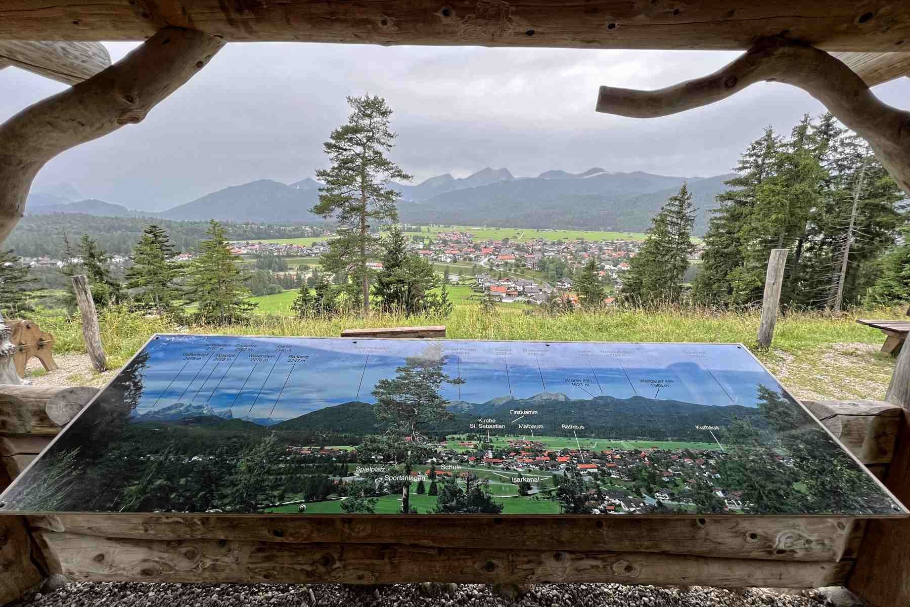 Von der Bushaltestelle aus spaziert man zunächst am Maibaum vorbei und biegt dann in die Schöttlkarspitzstraße in Richtung Rathaus, anschließend weiter hinab in Richtung der Isar. Von hier aus geht man über die Isarbrücke, dann links der grünen Beschilderung in Richtung “Isar-Natur-Erlebnisweg“ weiter. Nach einem kurzen Stück auf dem Forstweg biegt man rechts ab, der nun folgende Pfad verläuft mit leichten Anstiegen durch den Wald zur Aussichtsbank, welche zum Verweilen und Brotzeit machen einlädt.