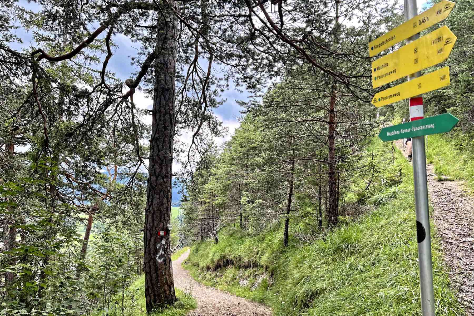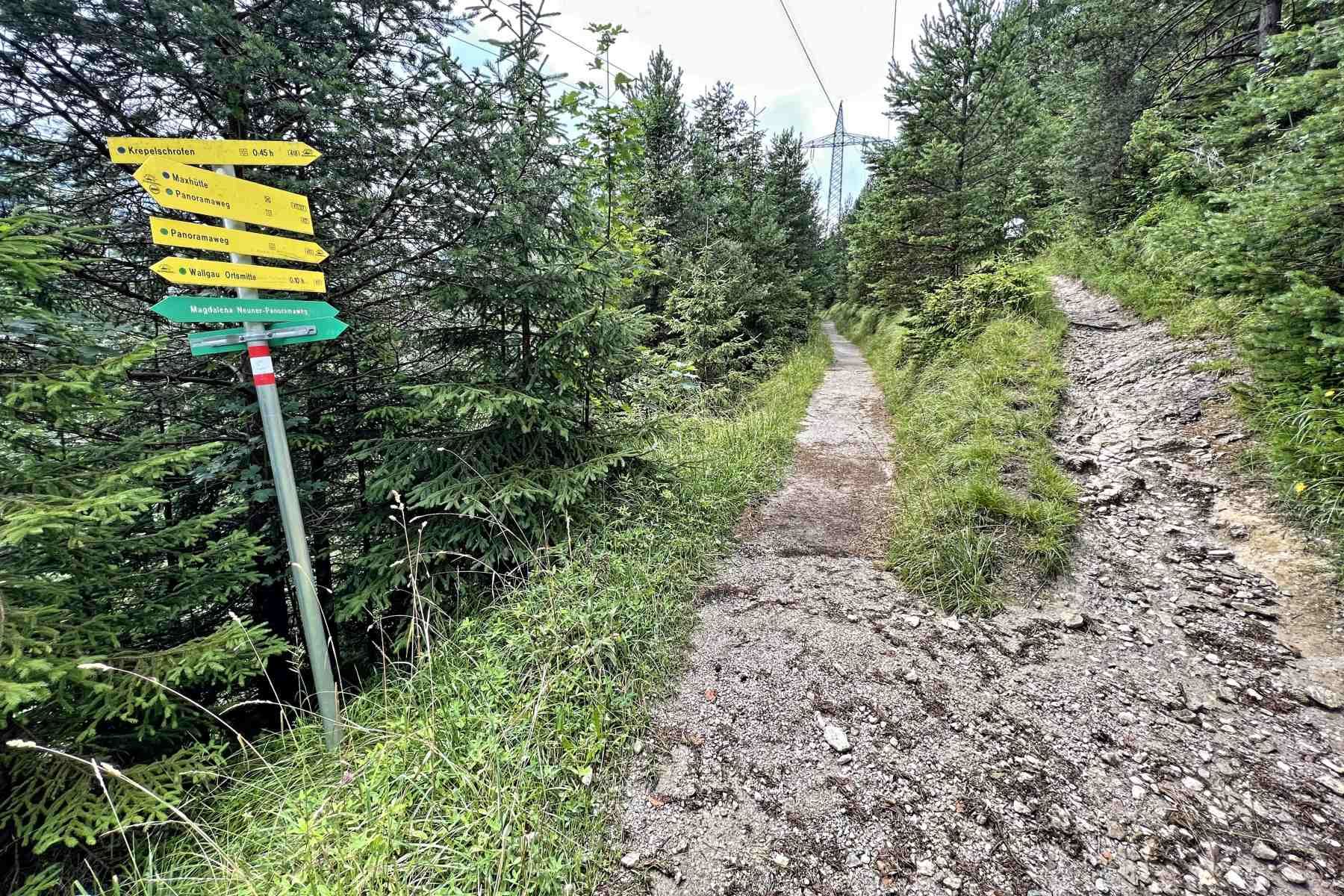 Von der Bushaltestelle führt uns ein Asphaltweg (vorbei an der Heizung/Sanitärwerkstatt) in den Wald. Nach einen kurzen Stück erreichen wir den informativen Magdalena-Neuner-Panorama Weg. Wir gehen nun nach links in Richtung Krepelschofen. Der nun folgende Pfad führt fast höhengleich bis zum nächsten Abzweig, den wir nach etwa 15 min ab Start Bushaltestelle erreichen. Wir gehen hier rechts auf dem Weg 418 zum Gipfel des Krepelschrofen. Der schmale Weg ist stark ansteigend und am Gipfel werden wir mit einer einmaligen Aussicht auf das Isartal, Soierngebirge und Karwendel belohnt.