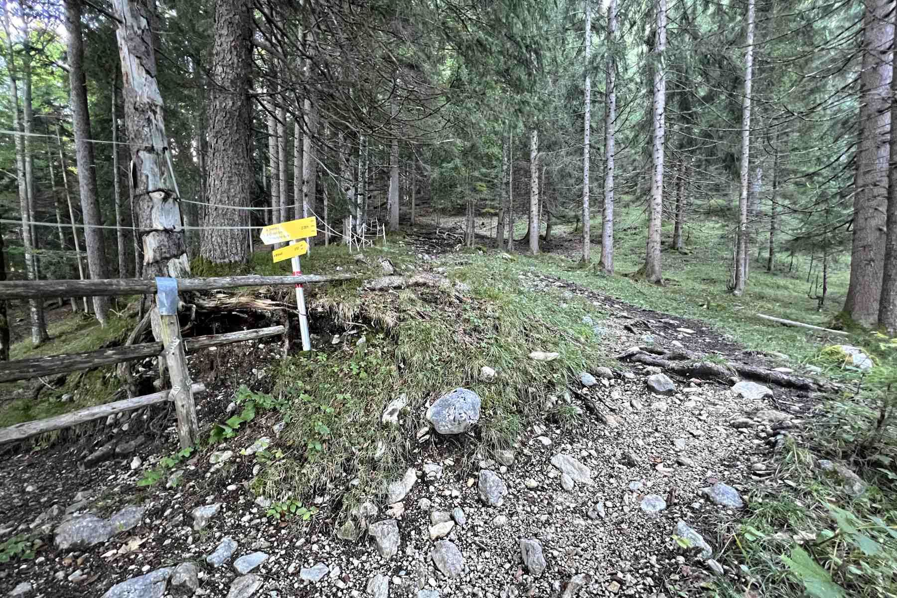 Nach etwa 15 min Gehzeit erreichen wir das Weidezaungitter. Hier steht ein Wegweiser in Richtung Vereiner Alm, aber keine Hinweis auf den Weg zur Rehbergalm. Vor dem Gitter führt nach rechts der Pad zur Rehbergalm. Bis zum Bergrücken ist dieser stetig ansteigend, teils steil.