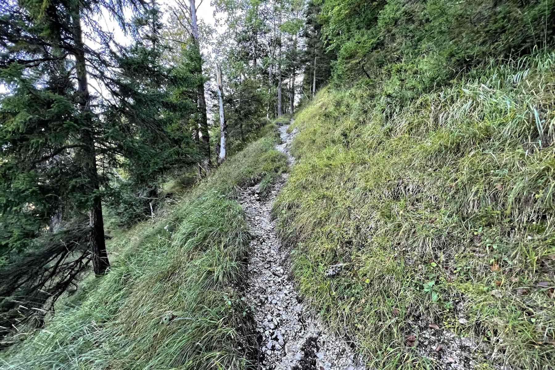 Vom Weidezaum bis zur Rehbergalm benötigen wir rund 1:25 Stunden. Der Pfad führt durch den schattigen Bergwald, der hin und wieder mit Aussichten auf die Soierngruppe unterbrochen wird.