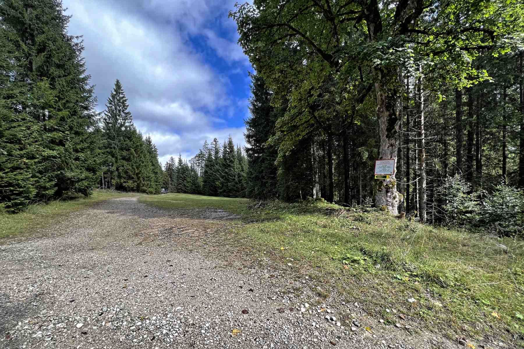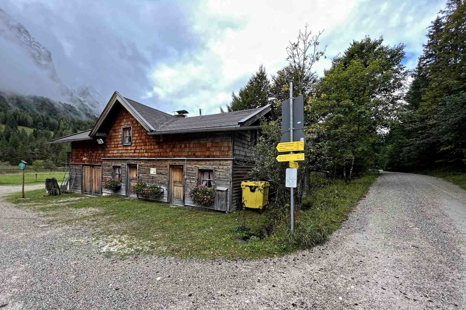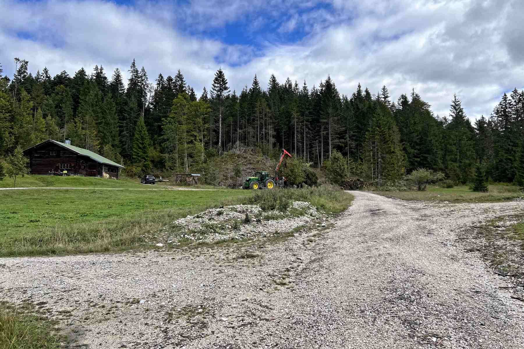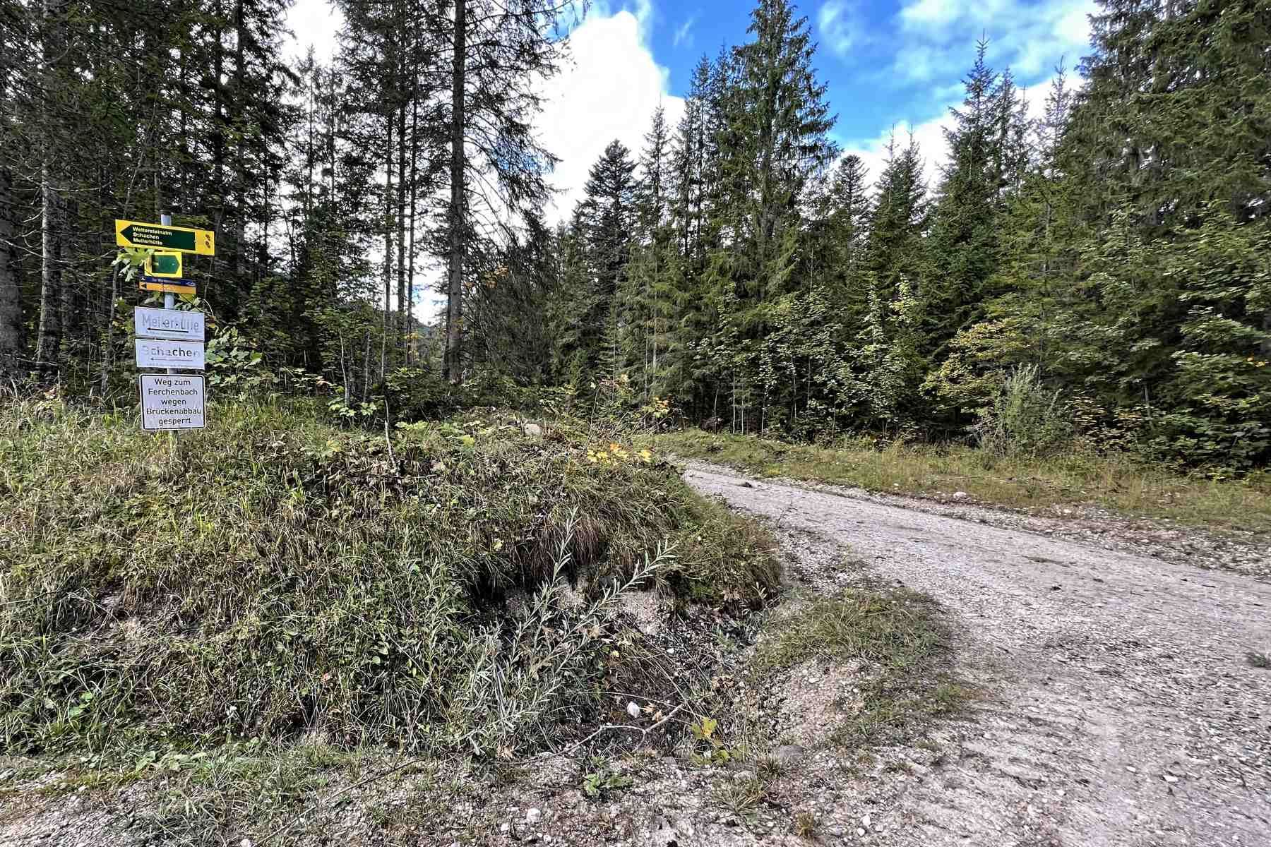 Nach einer Gehzeit von rund 45 Minuten auf der Forststraße kommen wir an eine scharfe Linkskurve, der welcher Wegweiser Richtung Schachen / Elmau stehen. Hier gehen wir leicht rechts/geradeaus weiter um zur Steilenhütte (nicht verwechseln mit der Meilerhütte) zu gelangen. Die Hütte ist nicht bewirtschaftet aber eine Bank lädt uns ein hier eine kurze Pause einzulegen.
