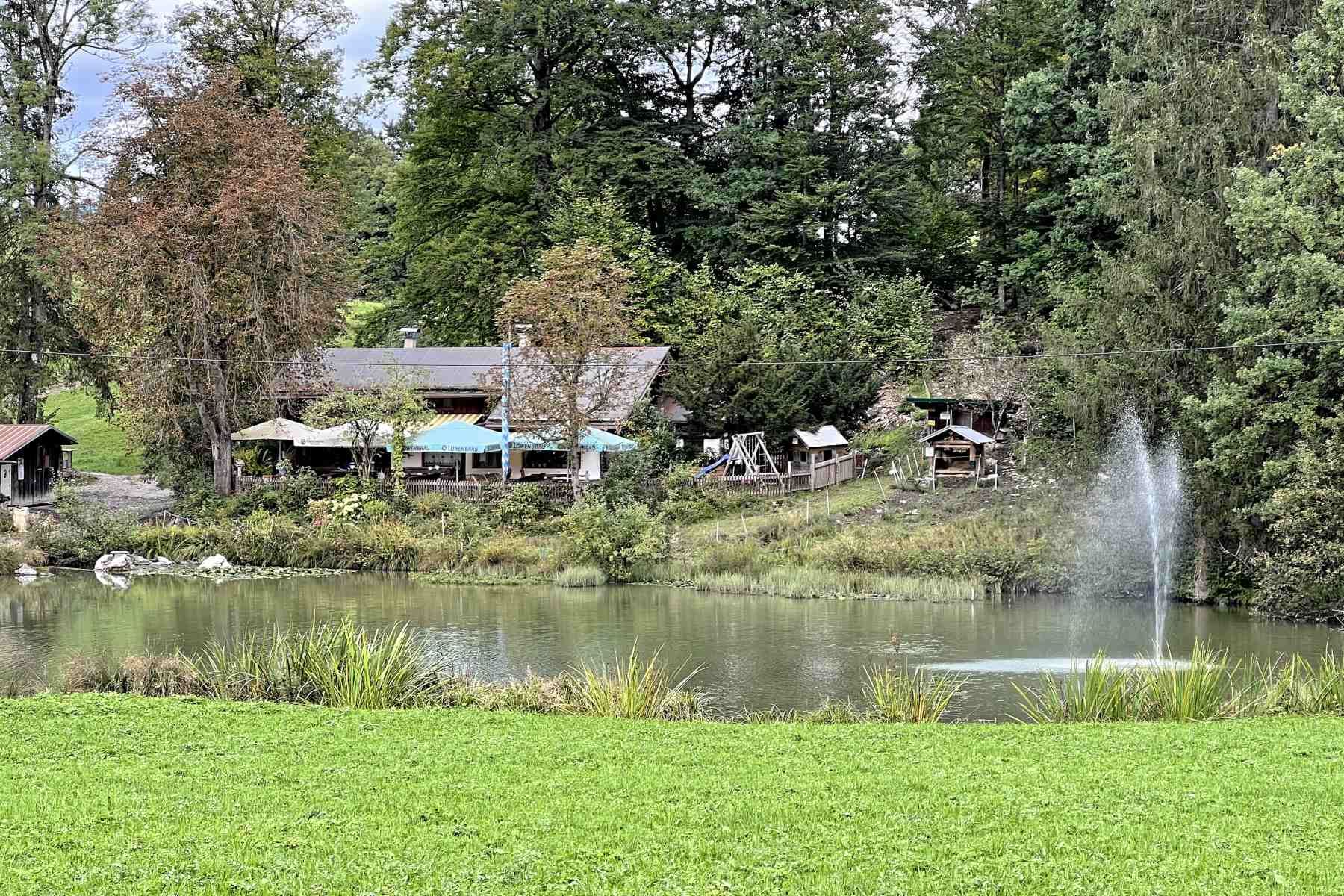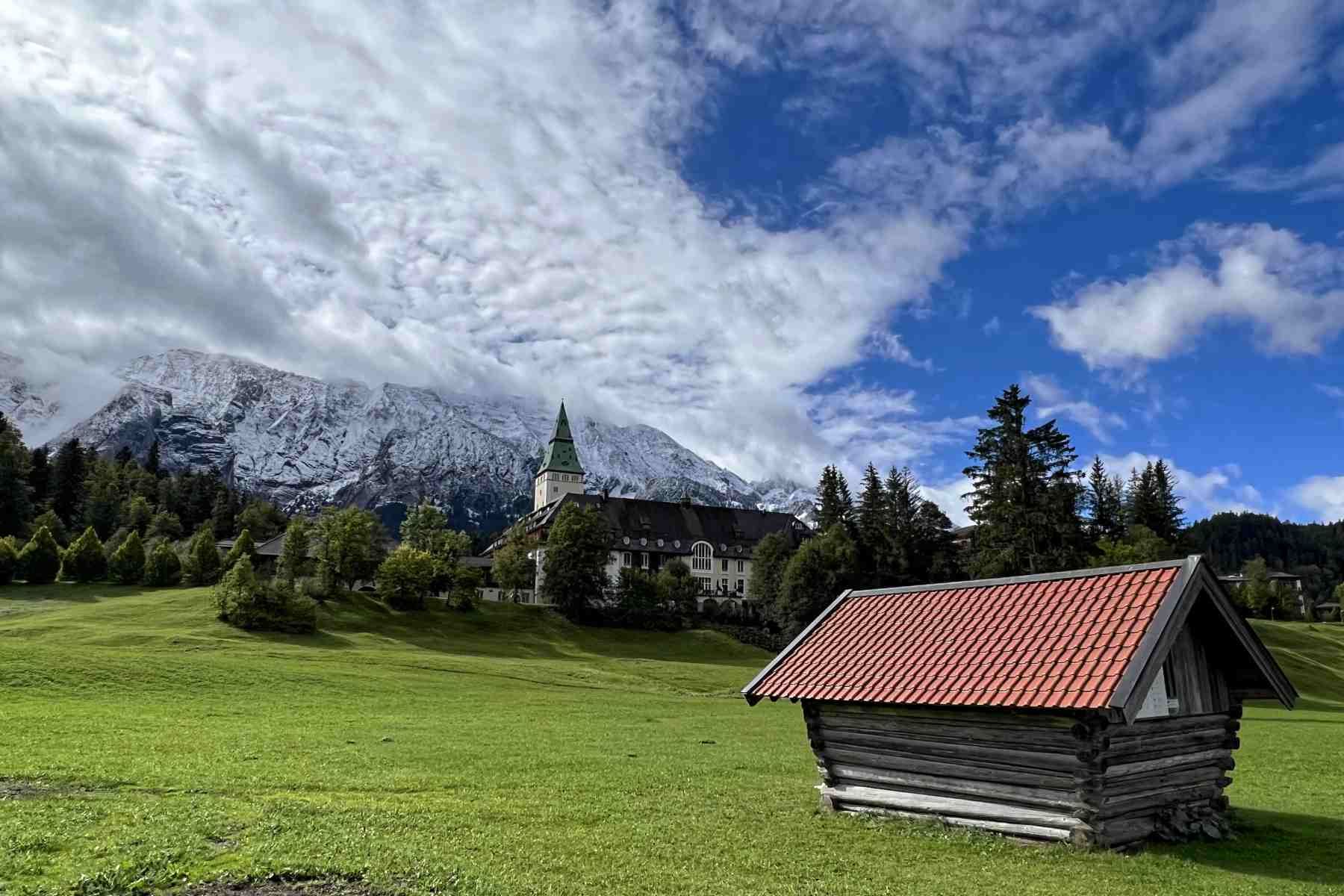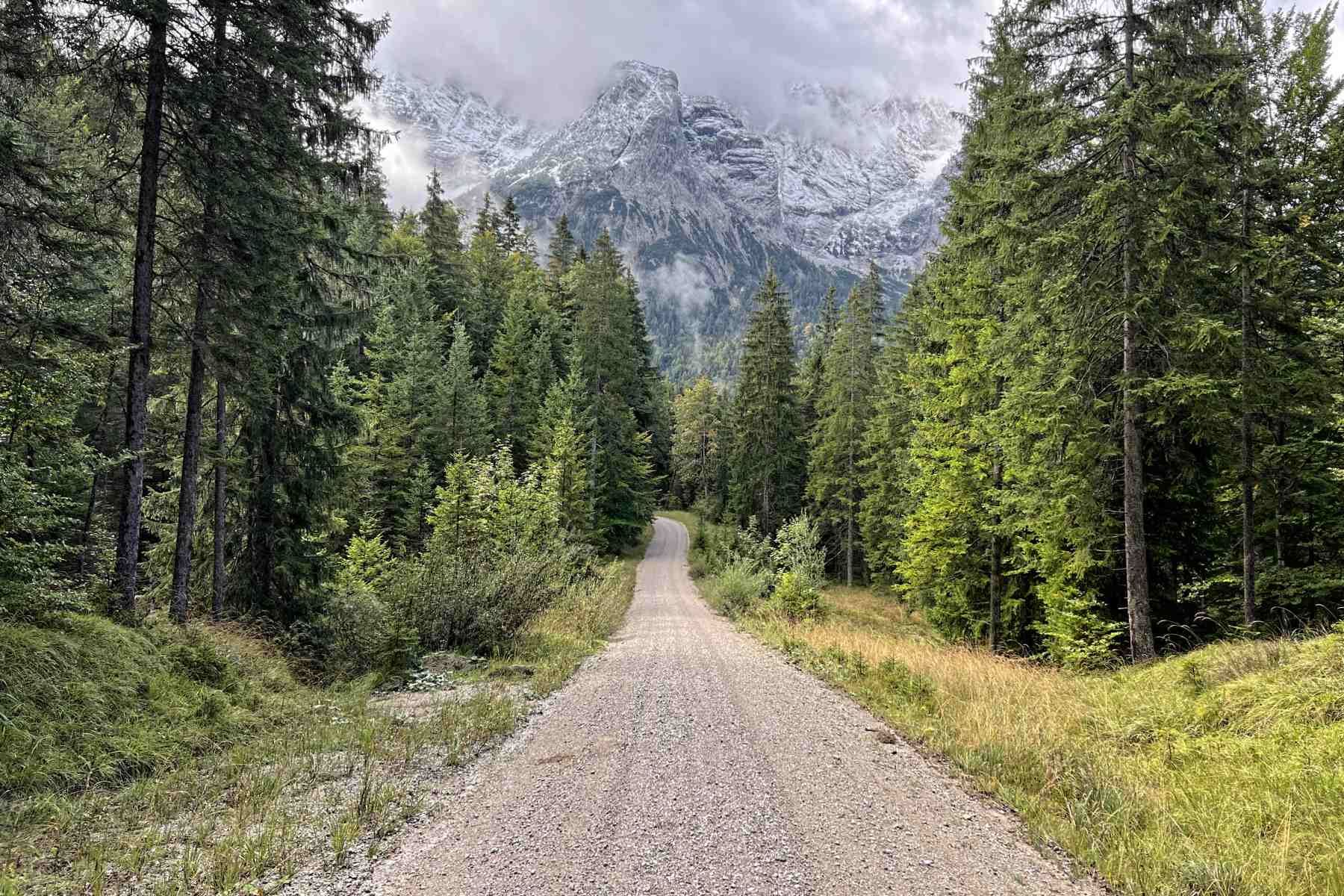 Beide Wege führen führen zum Schloss Elmau, welches wir um runden und noch ein Foto mit der herrlichen Bergkulisse der Wettersteinwand machen. Vom Schloss orientieren wir uns an den Wegweisern in Richtung Schachen/Wettersteinalm und beginnen den leichten Anstieg auf dem Königsweg.