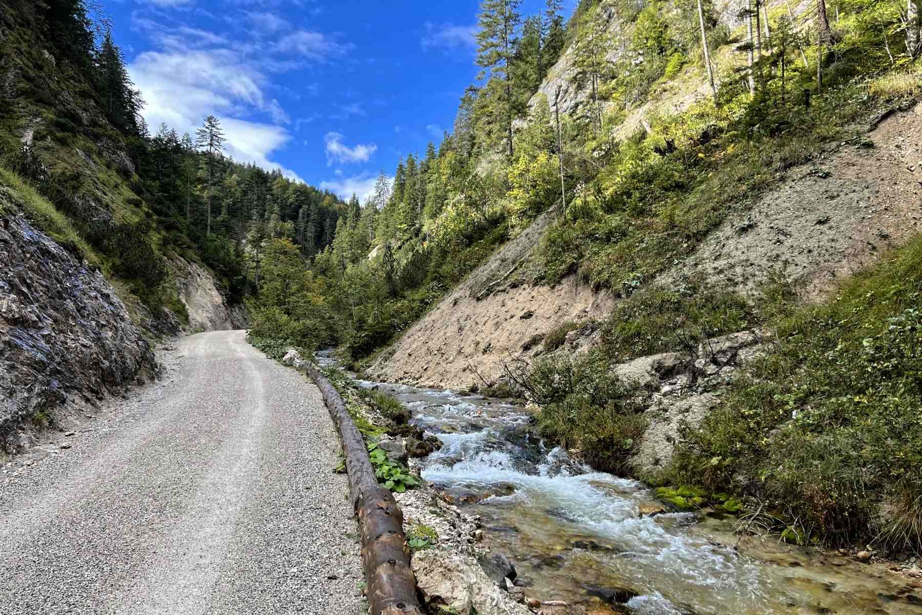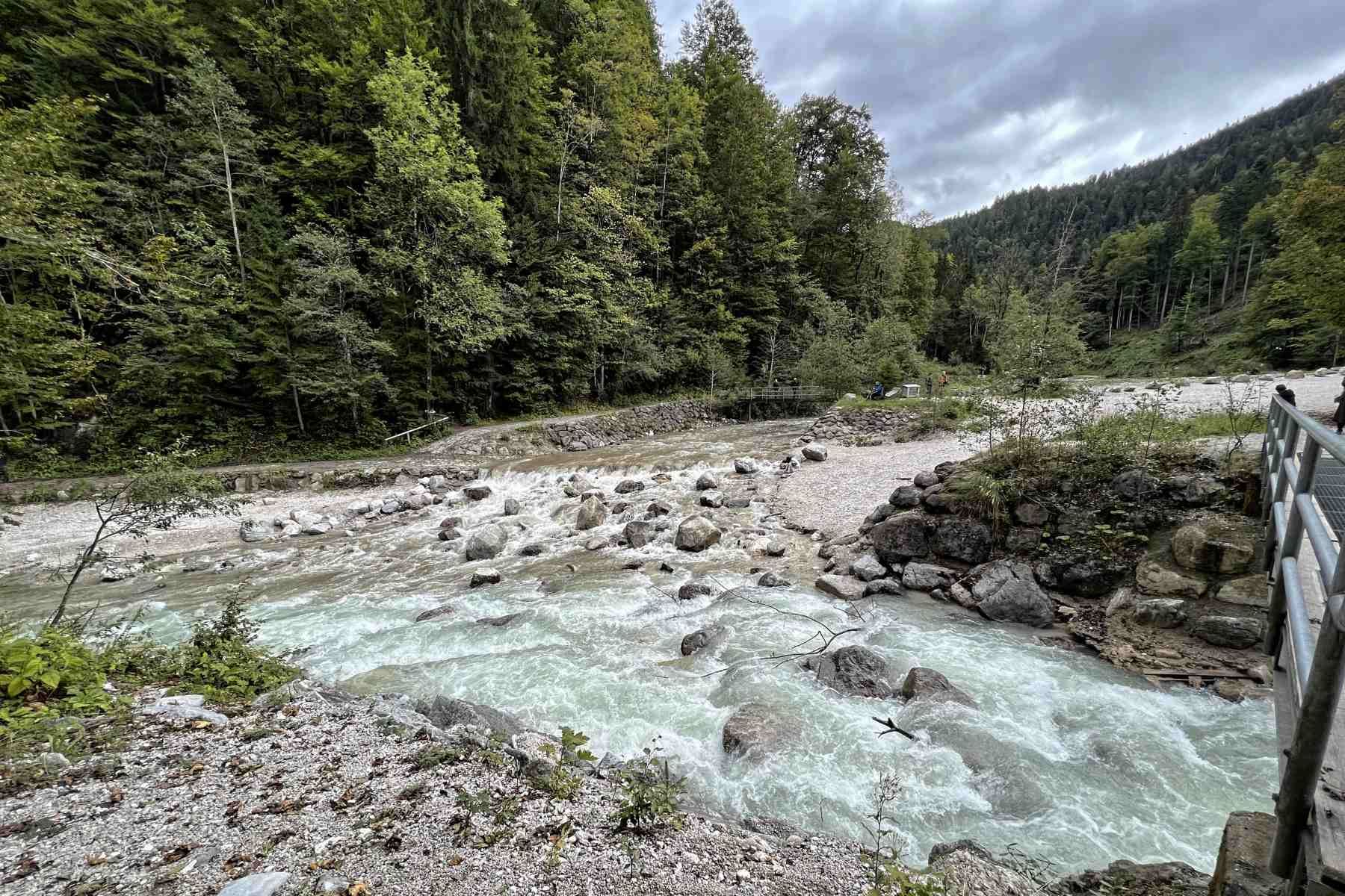 Am Zusammenfluss von Partnach und Ferchenbach erreichen wir den Talboden. Wer die Tür über die Partnachklamm abkürzen möchte folgt den Steg rechts in Richtung der Klamm oder so wie wir es geplant hatten nach links über die Partnach in Richtung der Partnachalm.