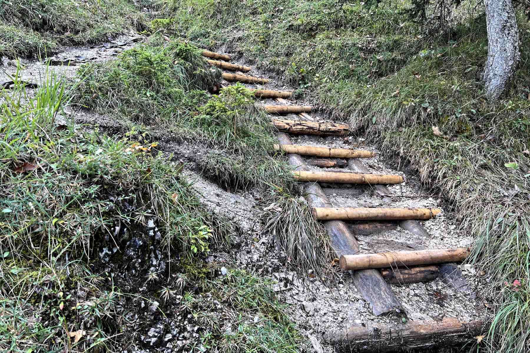 Ab jetzt geht es stetig, teils steil, bergab in das Partnachtal. Serpentinen und Stufen wechseln sich ab und nur zu Anfang des Abstiegs hat man einen Ausblick auf Wank, Eckbauer und zwischendurch auf die Partnachalm.