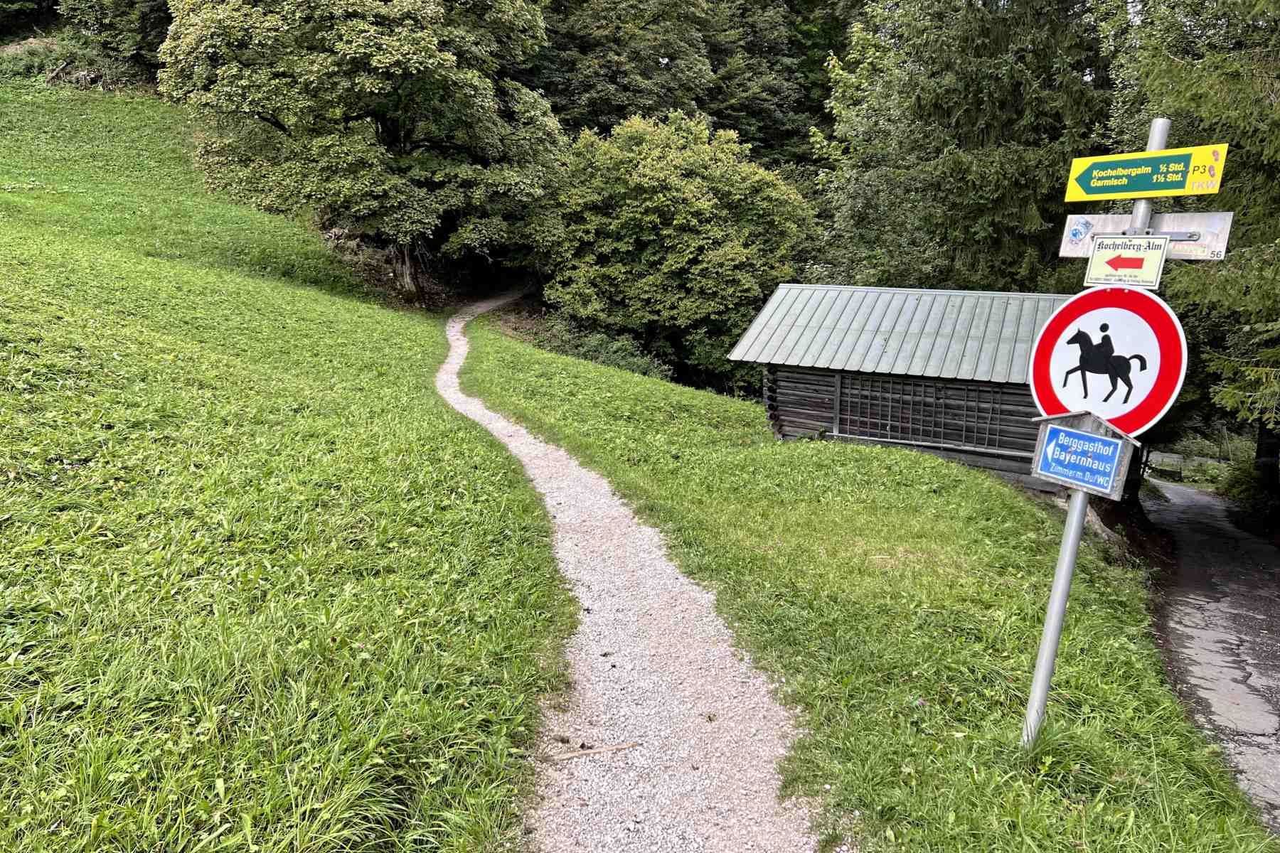 Direkt an der Bushaltestelle steht der Wanderwegweiser, der uns die Richtung nach Elmau zeigt. Nach kurzer Gehzeit können wir uns entscheiden entweder über den Weg 820 am Ferchenbach nach Elmau zu gehen oder über den weniger frequentierten Weg 807 (mit leider Steigung).