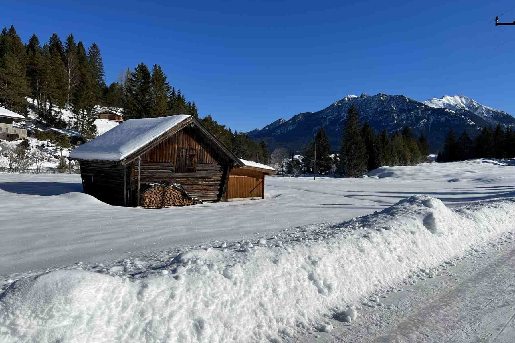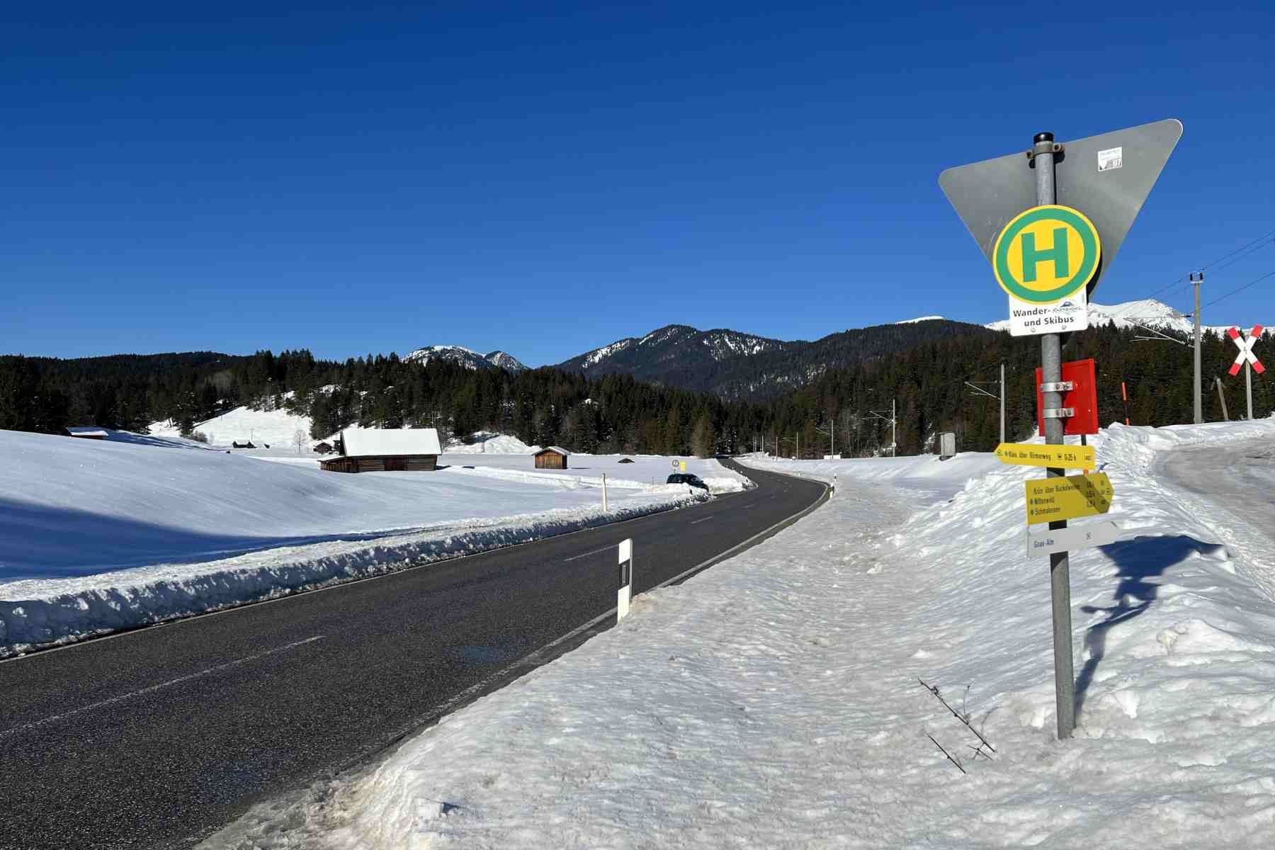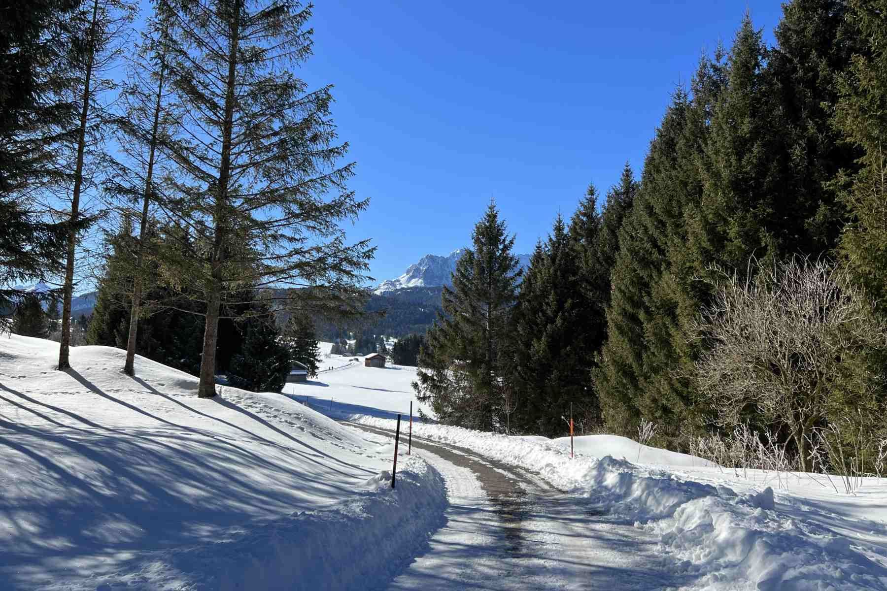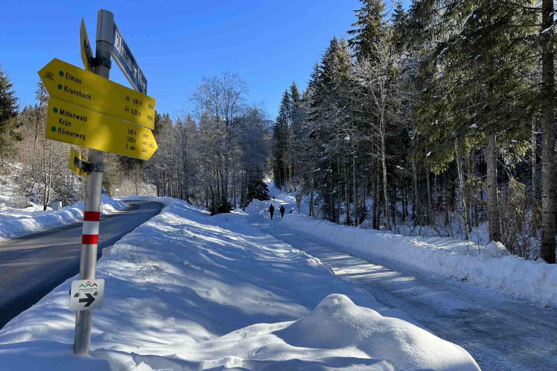 Eine aussichtsreiche Winterwanderung von Klais nach Mittenwald. Die Strecke verläuft über den Römerweg, mit einem sehr leichten Anstieg auf die Buckelwiesen mit tollen Bergpanoramen und Einkehrmöglichkeit in der Goas-Alm. Weiter geht es vorbei am Schmalensee mit Ziel Mittenwald.