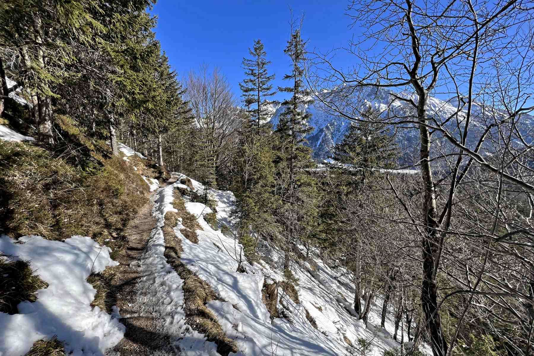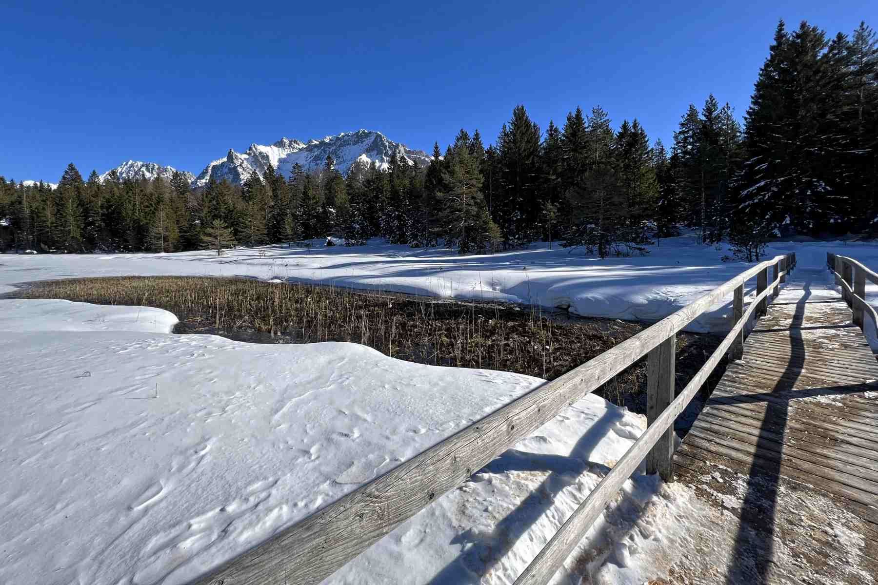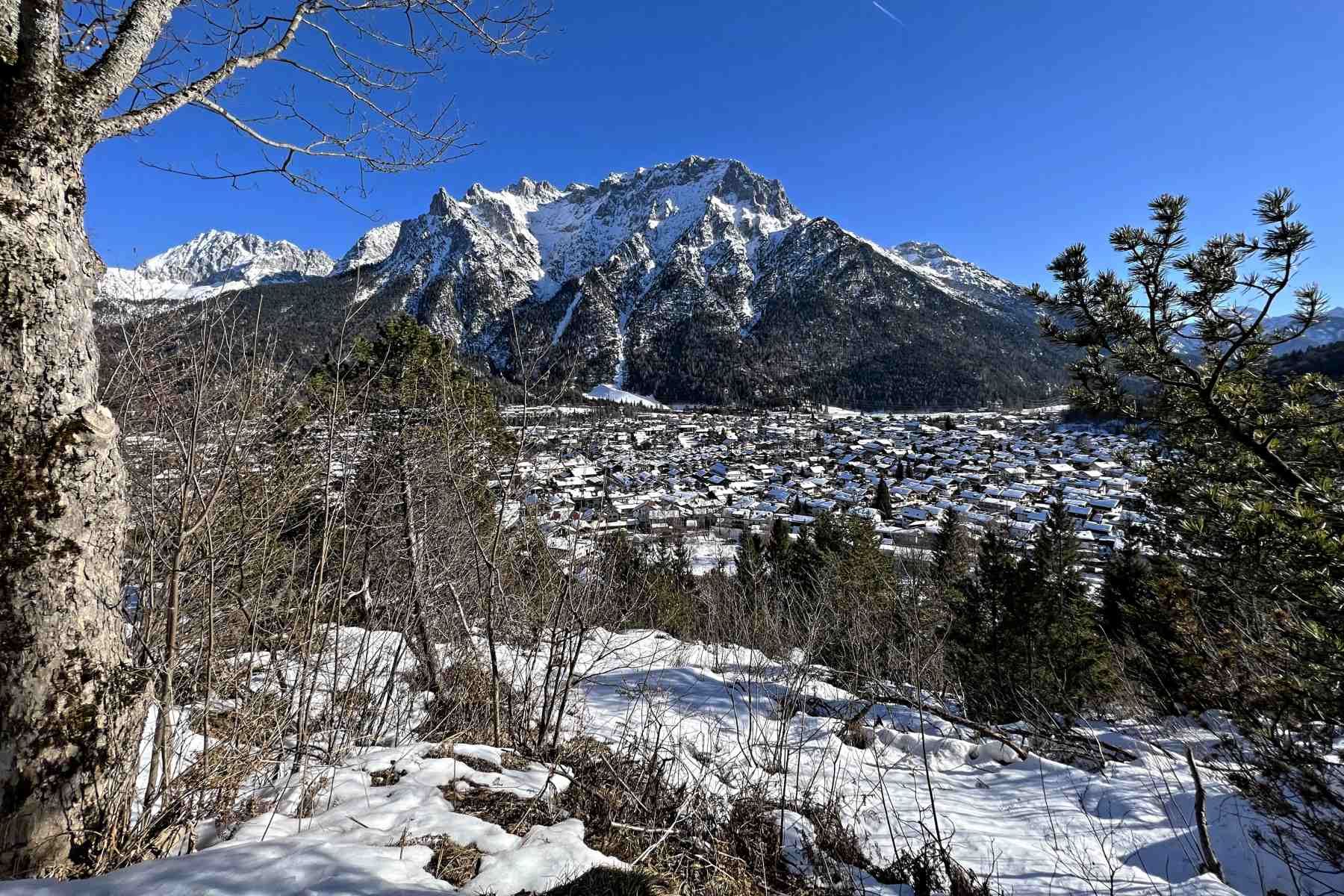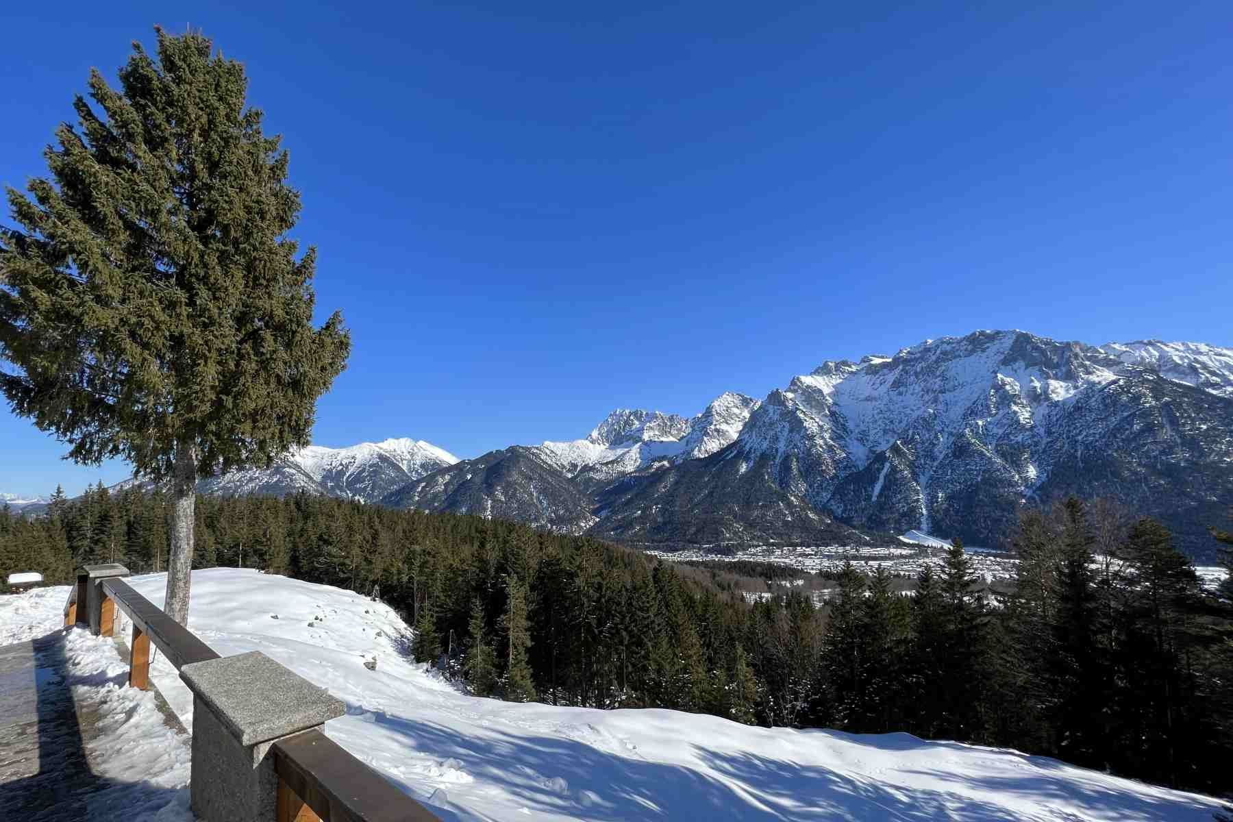 Leichte Tour im beliebten Wandergebiet Kranzberg: Nach einer Bergfahrt mit dem Kranzbergsessellift steigen wir durch den Winterwald zum Lautersee ab. Nach Mittenwald steigen wir über den Steingarten ab und haben einen prächtigen Blick auf Mittenwald und den Karwendel.